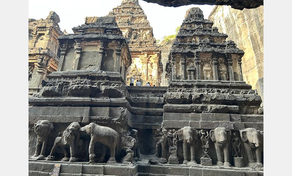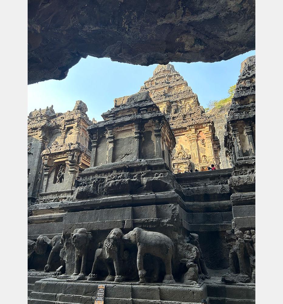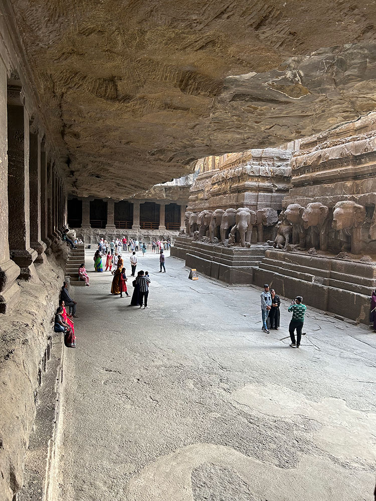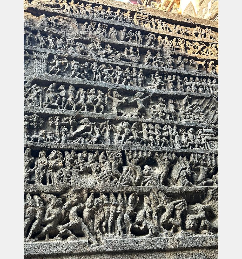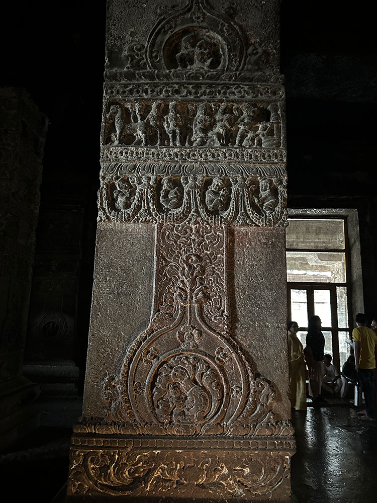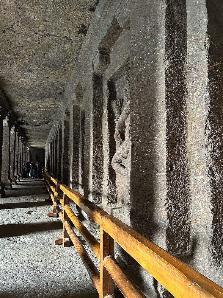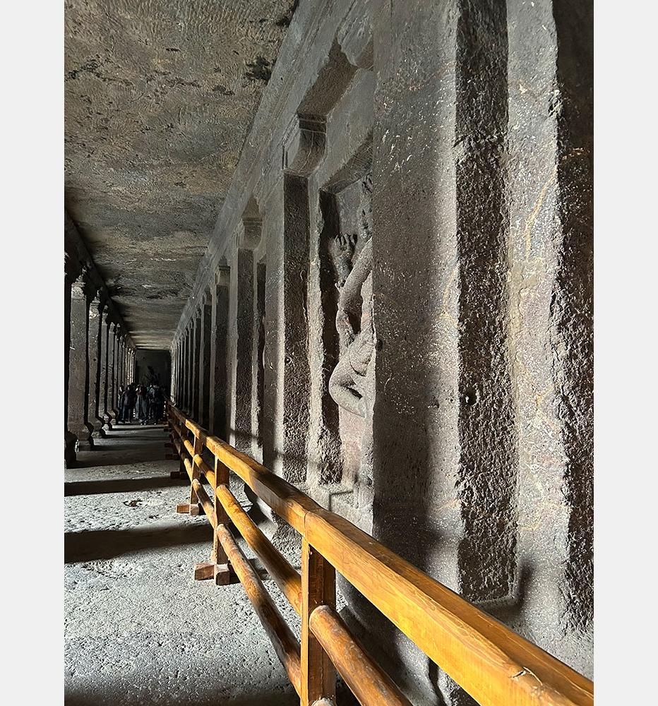 There are 34 caves in total, dating from the 5th to 10th centuries CE. The pillars are richly carved with foliage, Mithunas and also Jataka tales. Caves 1 to 12 are primarily Buddhist, with notable examples like the Chaitya Hall (Cave 10) featuring a large stupa. Caves 13 to 29 display Hindu themes, with the impressive Kailasa Temple (Cave 16), which is a monolithic structure carved from a single rock. Caves 30 to 34 are Jain, featuring intricate carvings and altars.