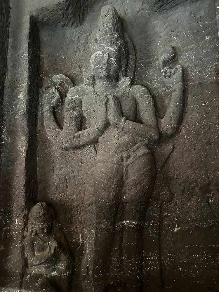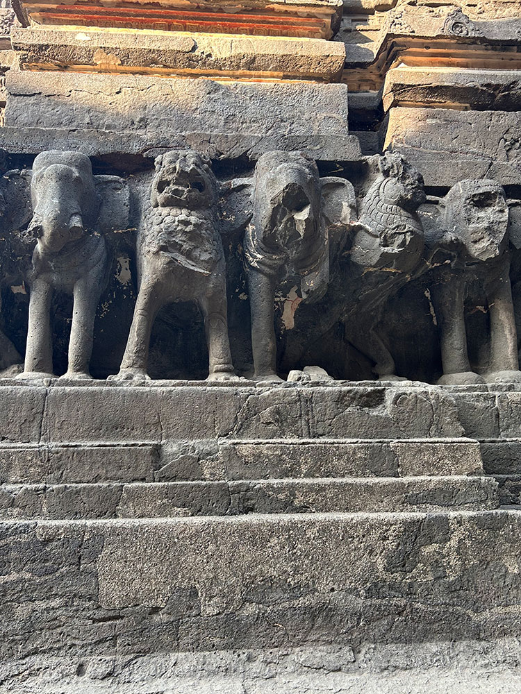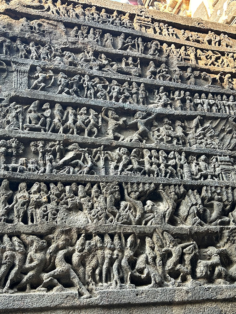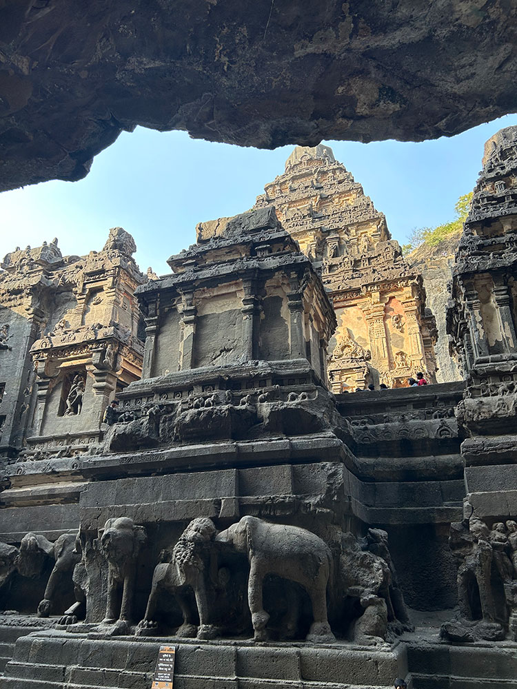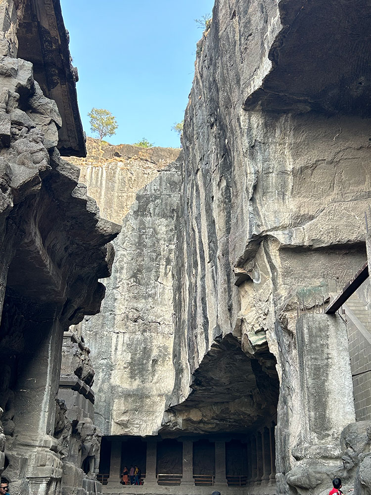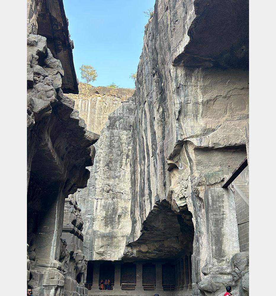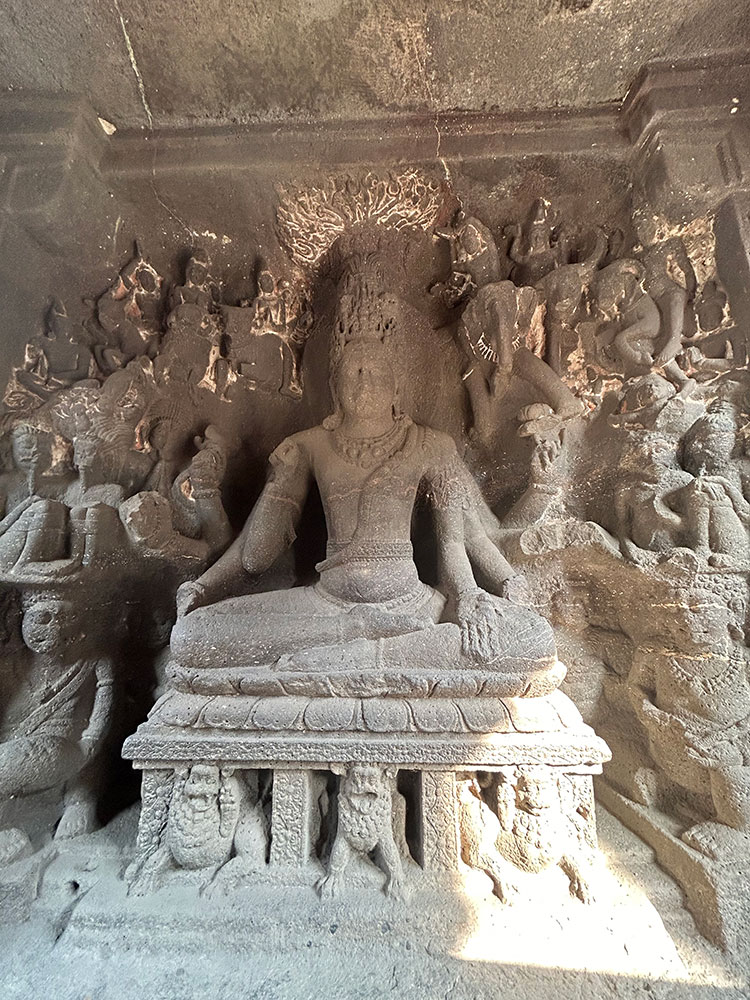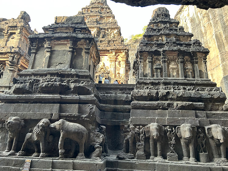 There are 34 caves in total, dating from the 5th to 10th centuries CE. The pillars are richly carved with foliage, Mithunas and also Jataka tales. Caves 1 to 12 are primarily Buddhist, with notable examples like the Chaitya Hall (Cave 10) featuring a large stupa. Caves 13 to 29 display Hindu themes, with the impressive Kailasa Temple (Cave 16), which is a monolithic structure carved from a single rock. Caves 30 to 34 are Jain, featuring intricate carvings and altars.