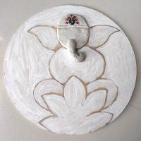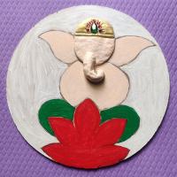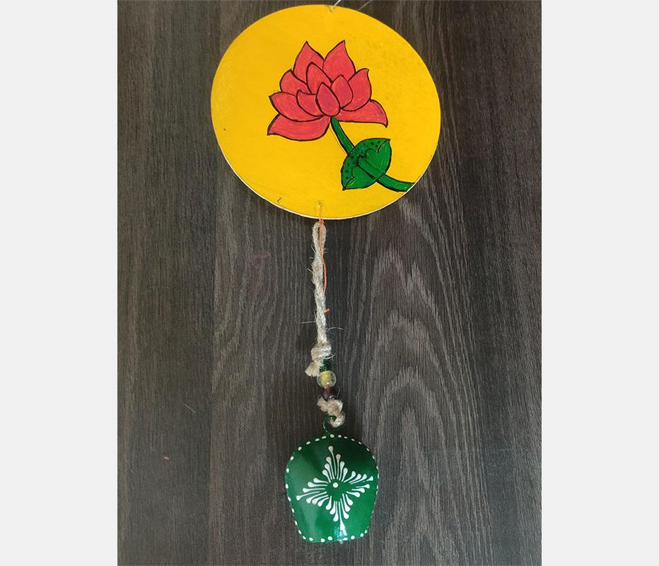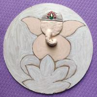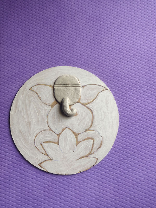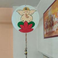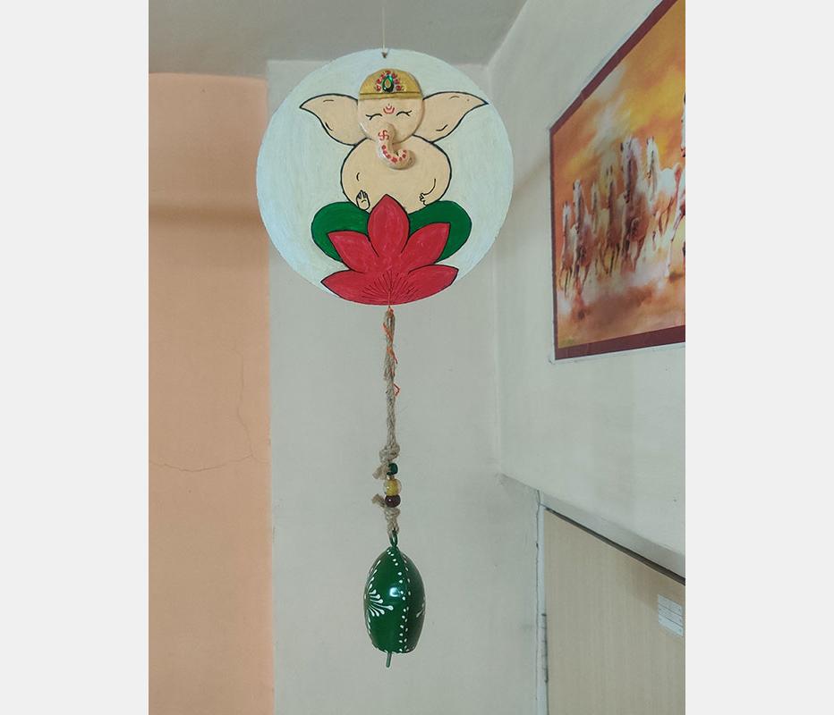 The process starts by cleaning and drying the cake base, then applying a white base coat to both sides. Next, you use the Pidilite moldit art clay to shape Ganesha's face. Once it has dried properly, you can add color using acrylic paints. To finish it off, attach a cow-bell at the bottom, which can double as a wind chime. This charming wall hanging is a beautiful addition to any balcony!