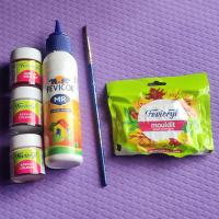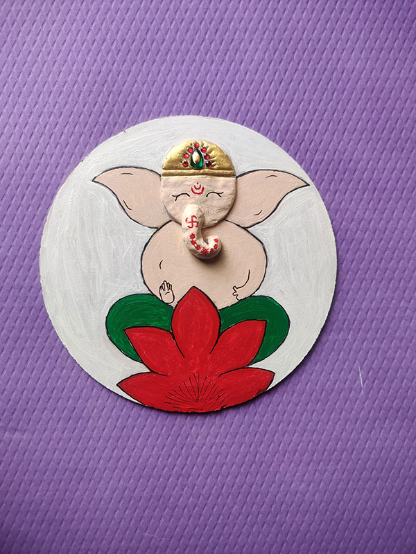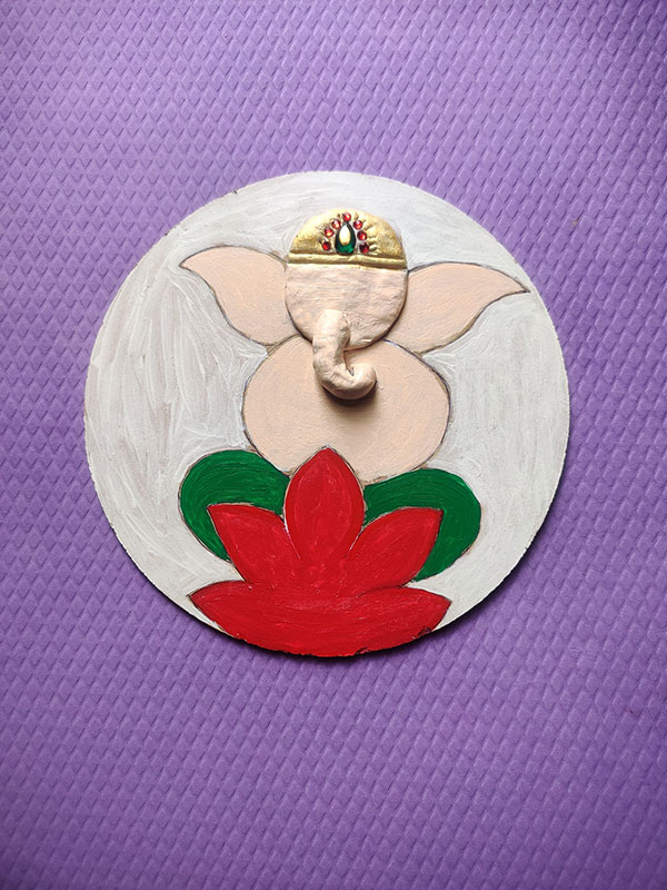 We usually order cakes for special occasions, and each one comes with a base. After collecting a few of these bases, I thought about reusing them creatively. I began searching on Google and came across a Ganesha wall hanging idea on Pinterest. It looked both fun and simple to make! You only need basic materials like Pidilite moldit art clay, acrylic paints, brushes, and a few decorative elements.