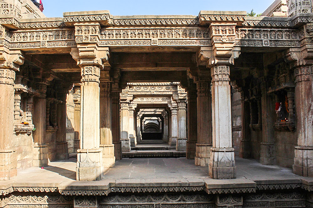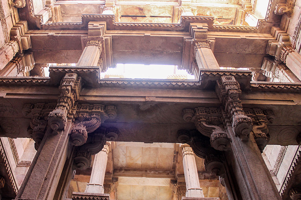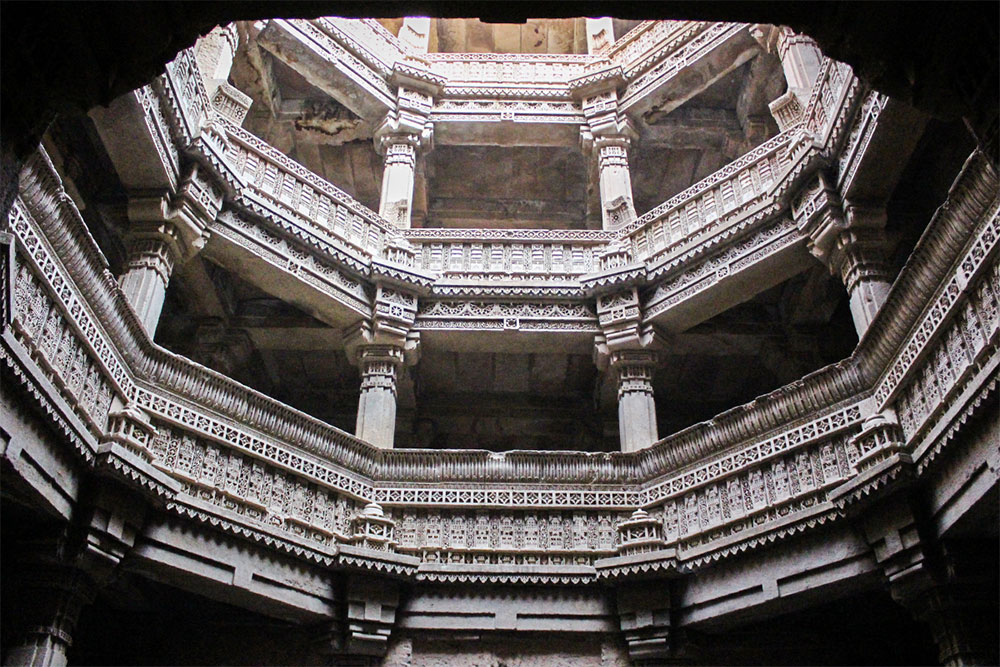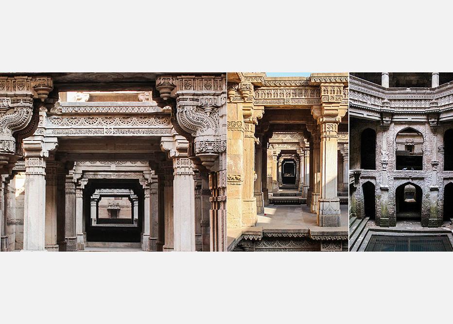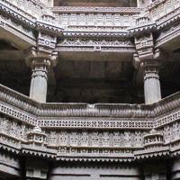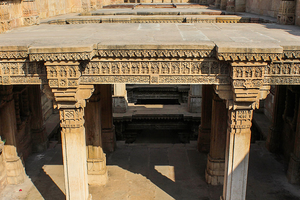 Adalaj stepwell is five stories deep, built-in sandstone in the Solanki architectural style. A stepwell is built on an intricately carved large number of pillars with an octagonal plan at the top. Each floor is so spacious that the people can hold gatherings. The light and air can enter the octagonal well as it has an opening in the ceilings above the landing. It is dug so deep that one can access groundwater at that level, accounting for seasonal fluctuations in water level due to rainfall over the years. As the direct sunlight does not touch landings except at noon, the atmosphere inside the well is six degrees cooler than the outside. A unique feature of this stepwell is that from the first story level, three staircases lead to the bottom water level of the well.