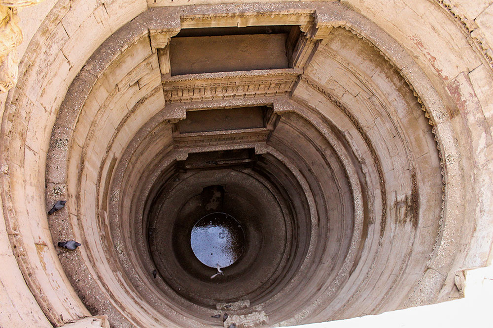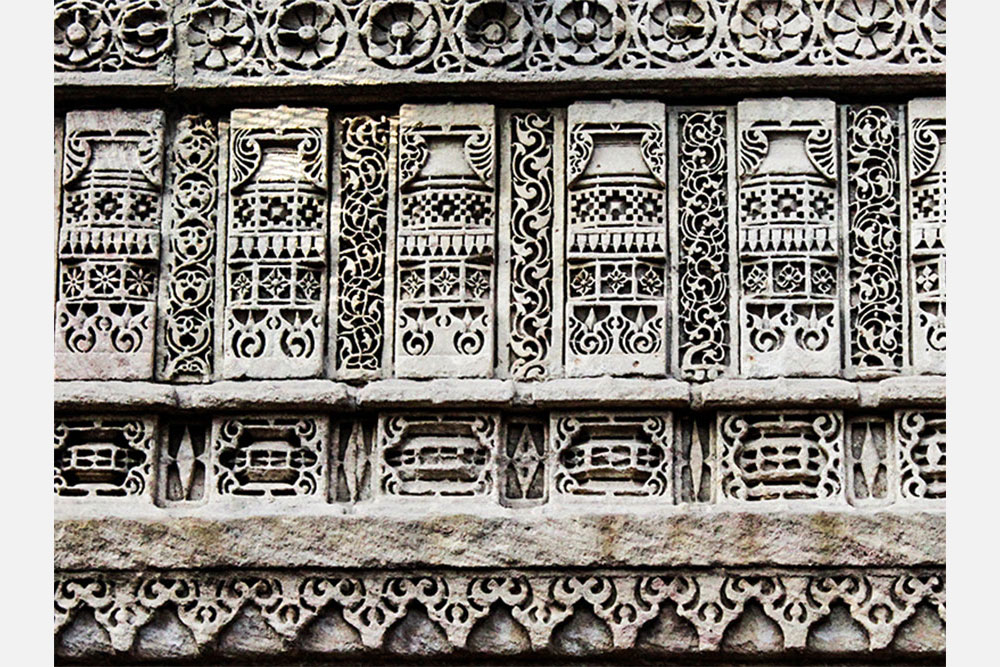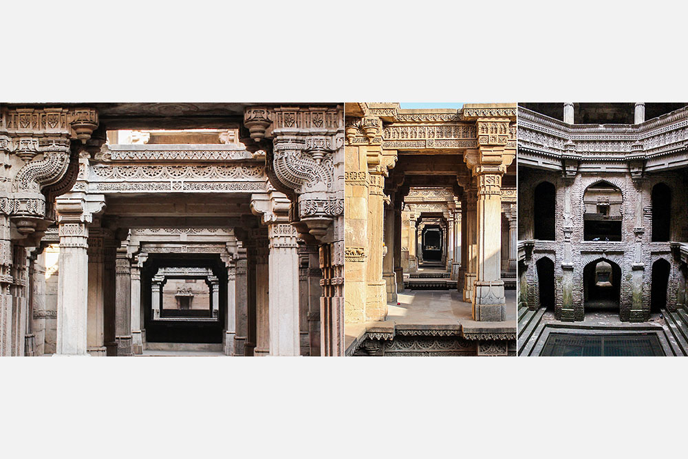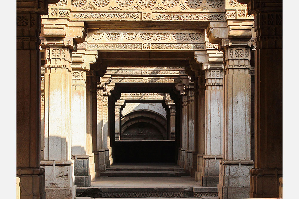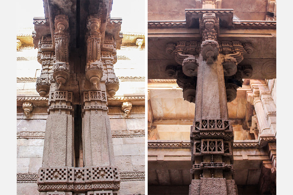 Adalaj stepwell is five stories deep, built-in sandstone in the Solanki architectural style. A stepwell is built on an intricately carved large number of pillars with an octagonal plan at the top. Each floor is so spacious that the people can hold gatherings. The light and air can enter the octagonal well as it has an opening in the ceilings above the landing. It is dug so deep that one can access groundwater at that level, accounting for seasonal fluctuations in water level due to rainfall over the years. As the direct sunlight does not touch landings except at noon, the atmosphere inside the well is six degrees cooler than the outside. A unique feature of this stepwell is that from the first story level, three staircases lead to the bottom water level of the well.