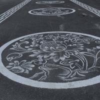 There are eight auspicious symbols in Tibetan Buddhism. Each one is said to represent a Buddhist teaching and when they appear together their powers get multiplied. They can be painted on the road, on doors, carved onto tables and so on.