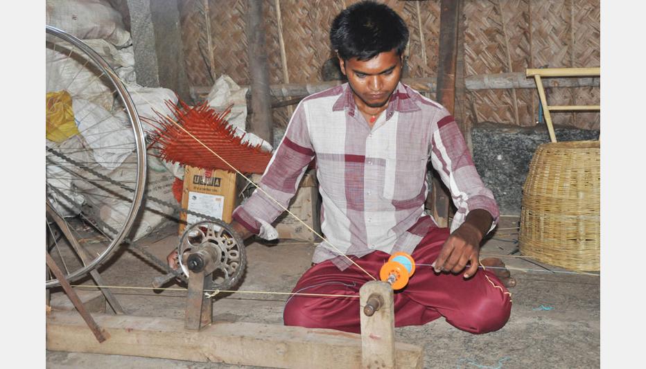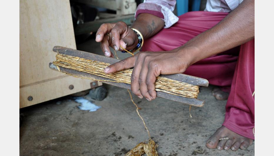 Artisans collect Banana bark from surrounding villages of Lakkavanahalli. Banana twine making is done in the streets preferably in the early morning. The bark is first split into small strips and soaked in water. Due to water treatment, the bark becomes smooth and soft. The strips are then hooked to the spinning wheel to make the lengthy yarn. As the spinning wheel starts rotating, the artisan walks backwards by adding the smaller strips of banana bark to form a long yarn. The yarn is reeled into small bundles and sent to weaving section for making mats and other eco-friendly decorative items. Minimum of 3 to 4 people required for yarn making. One person for operating spinning wheel and remaining for making twines.