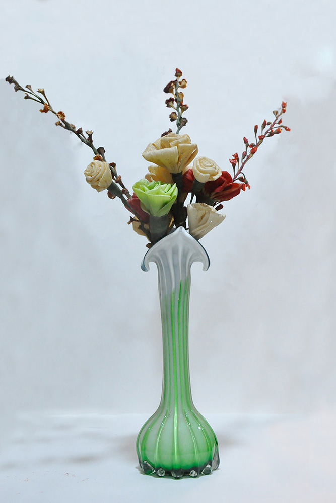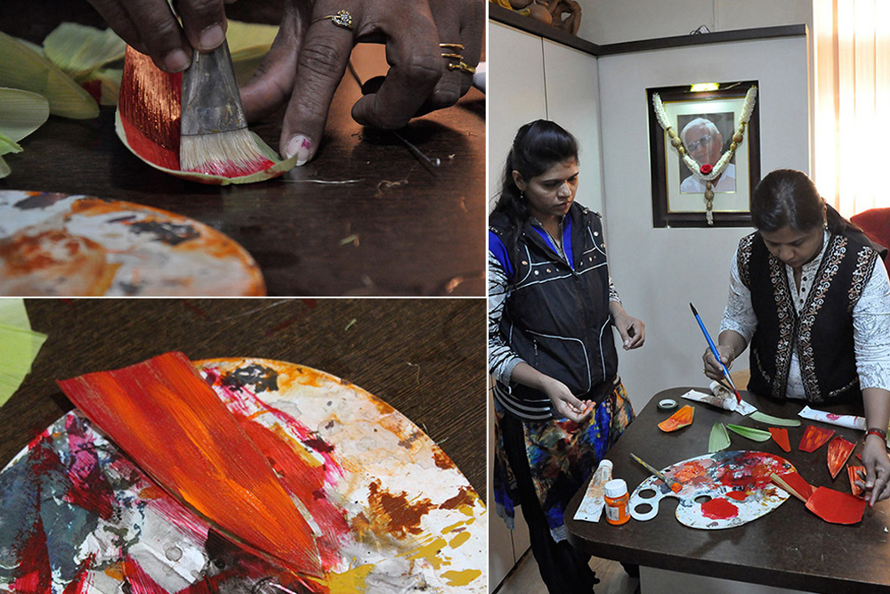• If required, the corn husks are painted in desired acrylic colours to form colourful flowers.