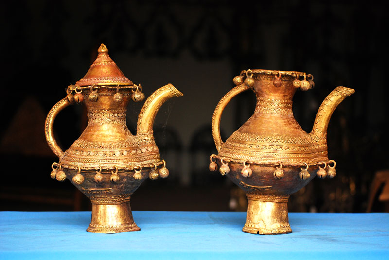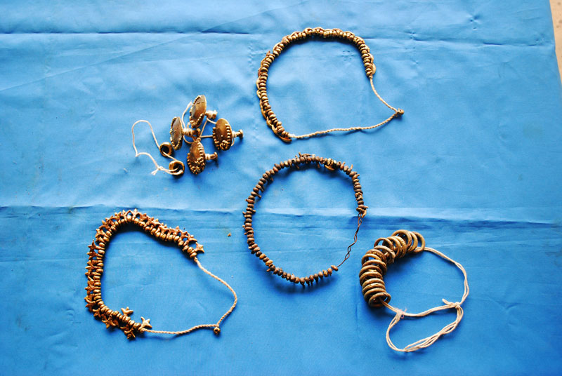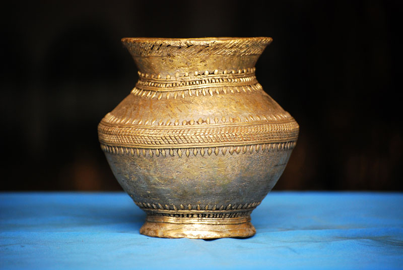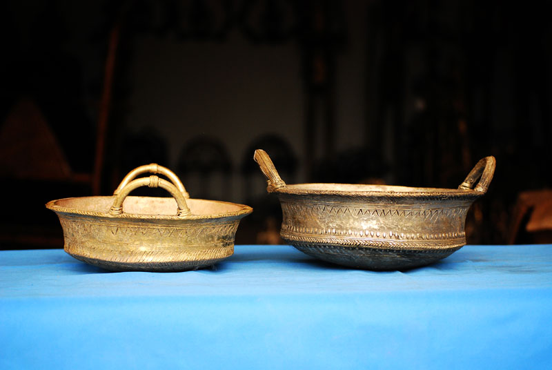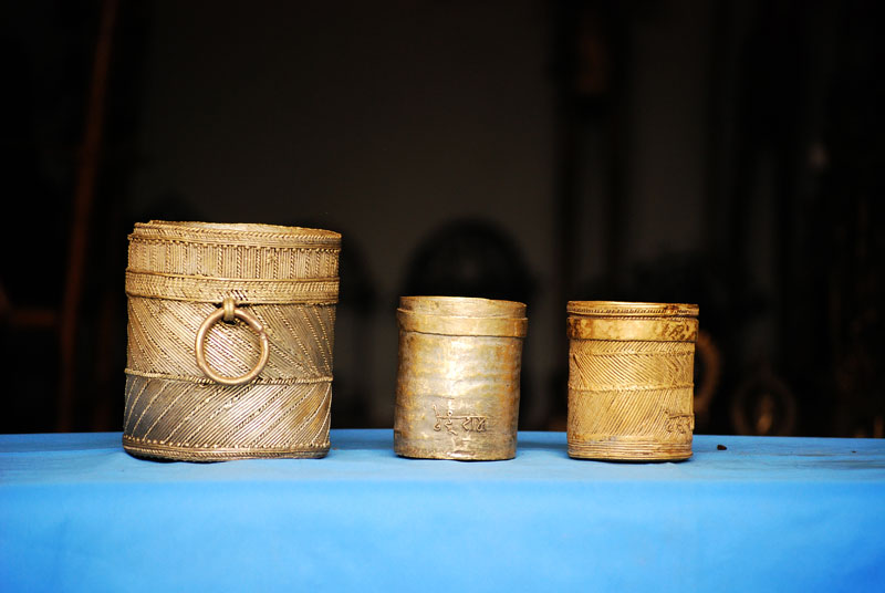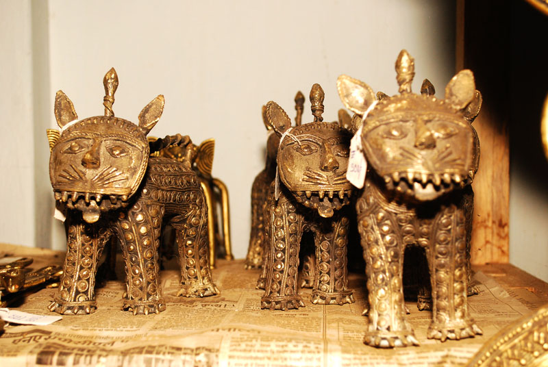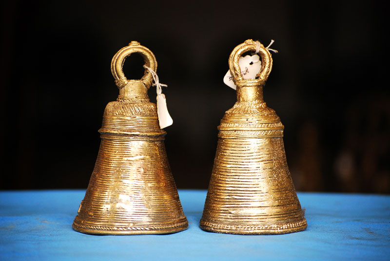The term "Dhokra" is believed to be deriving from the word "dhokna", which means to cast. "Dhokra Shilp" is the regional word for the craft of bell metal casting. It is one of the most distinguished craft of Chattisgarh. It is also famous for its traditional lost wax technique which has been carried forward since thousands of years of its origin. Artifacts similar to the present craft form have been discovered at the sights of Mohenjedaro and Harappa. Dhokra shilp is widely practiced by the Ghadwa community of Bastar. The handcraft includes traditional ornaments, animal and tribal figures, idols of the local deities, which are most popular in the region. Earlier bell metal crafts were used for ritualistic and daily use purposes only. Figurines of local deities in various sizes, lamps and utensils were made. Idol of Danteshwari Mata, most worshipped Goddess by the Gond tribal's of Bastar, was most the common product. Figurines of lovers "Jhitku Mitki", the local legend, are also amongst one of the favorites. Animal figures of horses, elephants and nandi are very popular amongst the craft lovers. Accessories like bell, oil lamps, incense stick holder and utility products like grain containers are the most saleable artifacts. Also intricately decorated necklace, anklet, bracelet and earrings can be seen in the craft market. Traditional ornaments are the most decorative products of Dhokra.