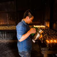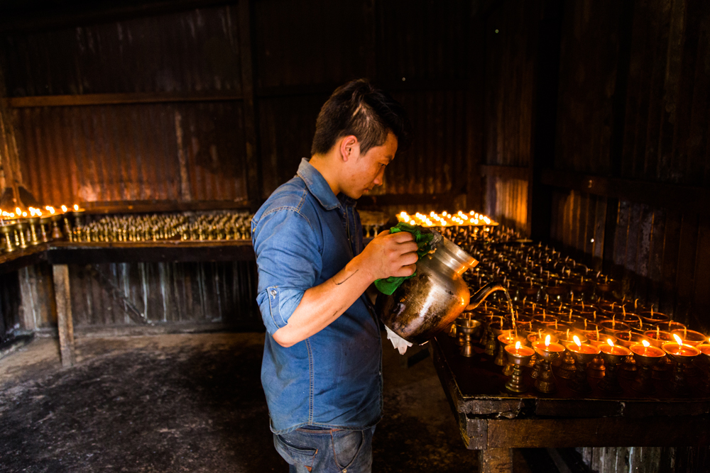 • A boy lighting butter lamps. Lights of the lamps represents the illumination of wisdom.