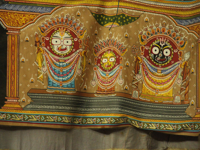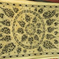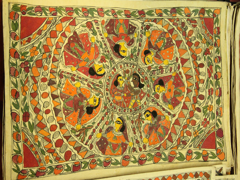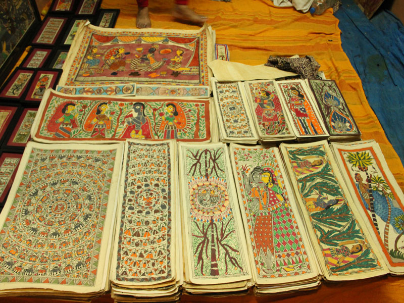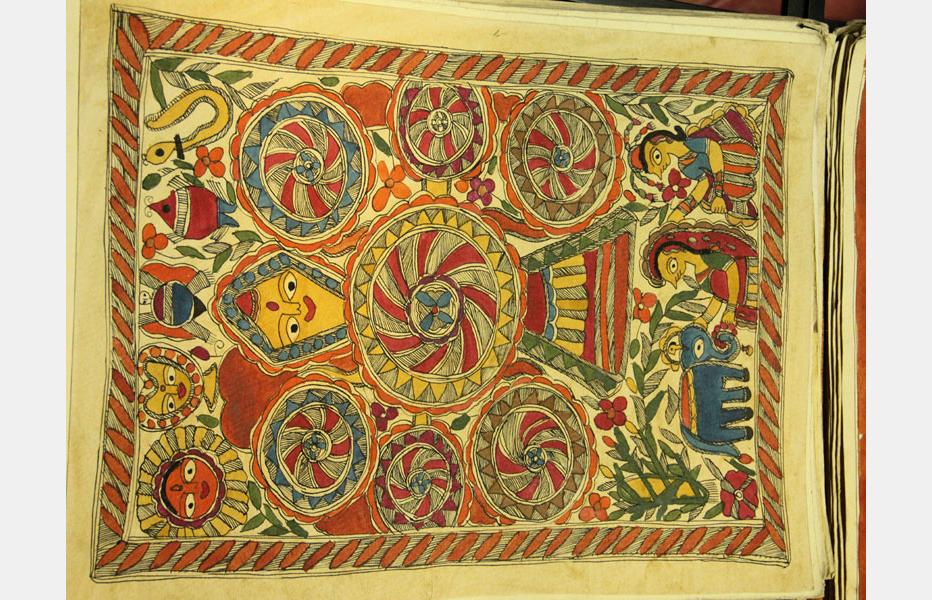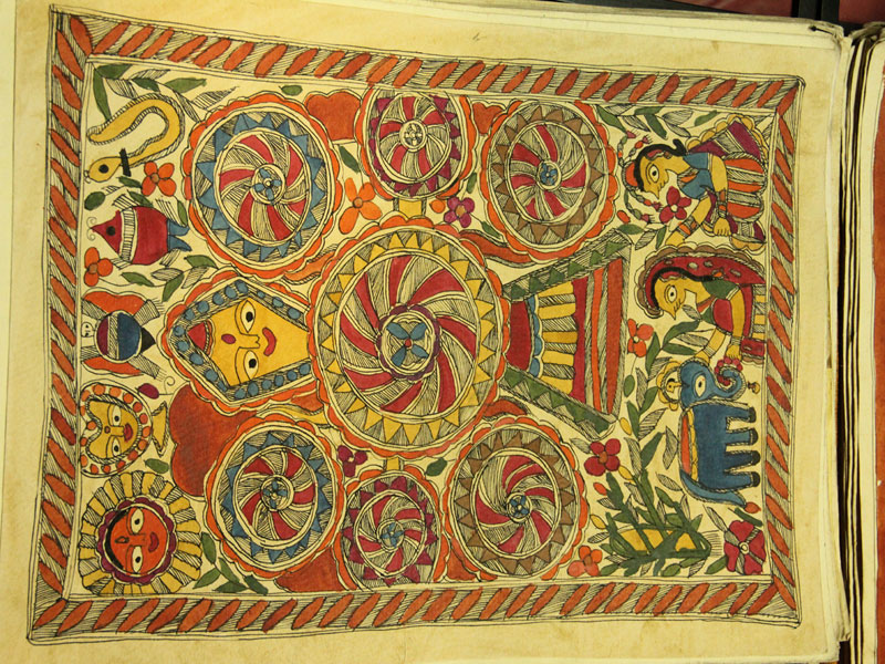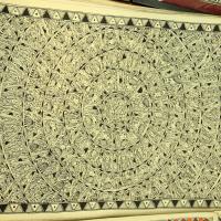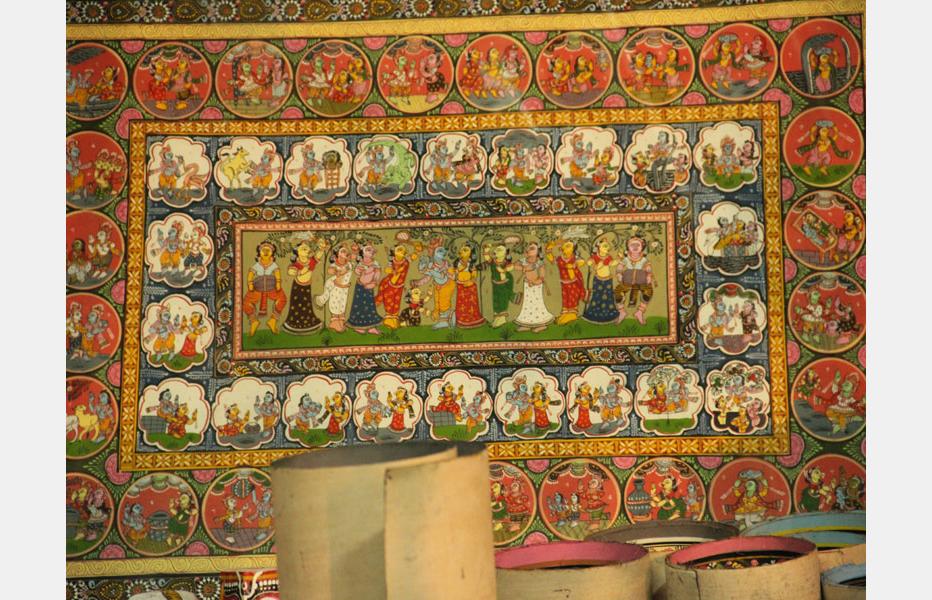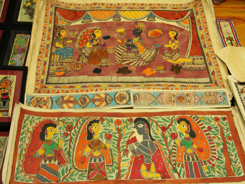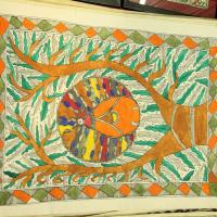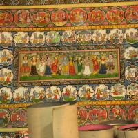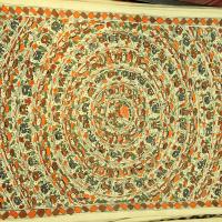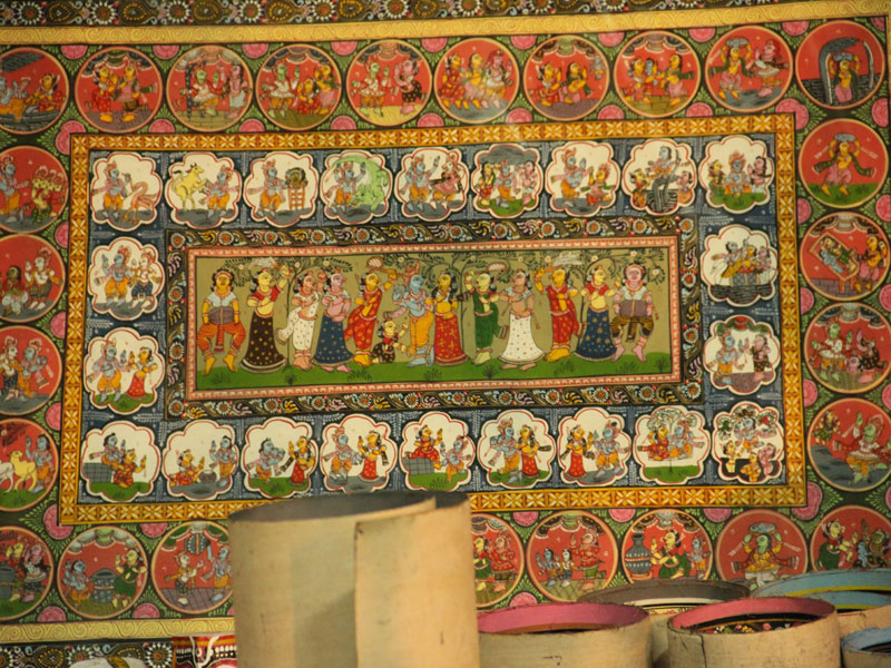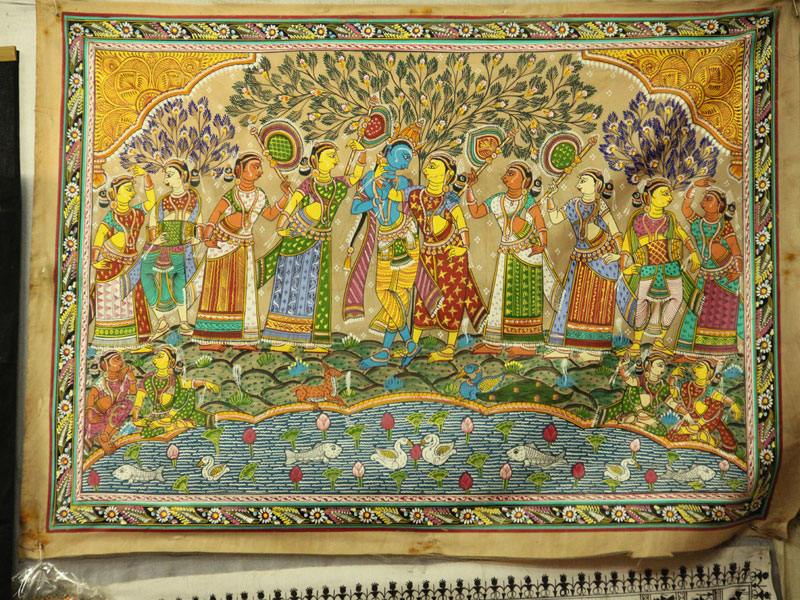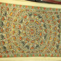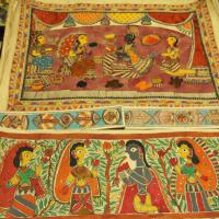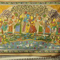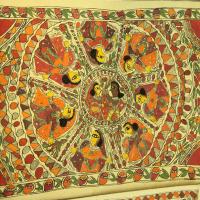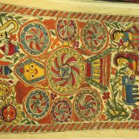These paintings are from Telangana, Andra Pradesh. Artists in the medieval age used the medium of paintings to convey messages from religious texts. The words of bard and poets were also converted into paintings for the common folk to see. These paintings sometimes ran into scrolls of several meters when depicting a chapter from Indian mythology. Telengana region is particularly well known for its folk paintings, very colourful and bright, that serve as ideal hall hangings. It is believed that the divine architect Vishwakarma handed it down to the artisans on earth. Mostly, the uses colour of folk paintings are red, yellow, green and blue.