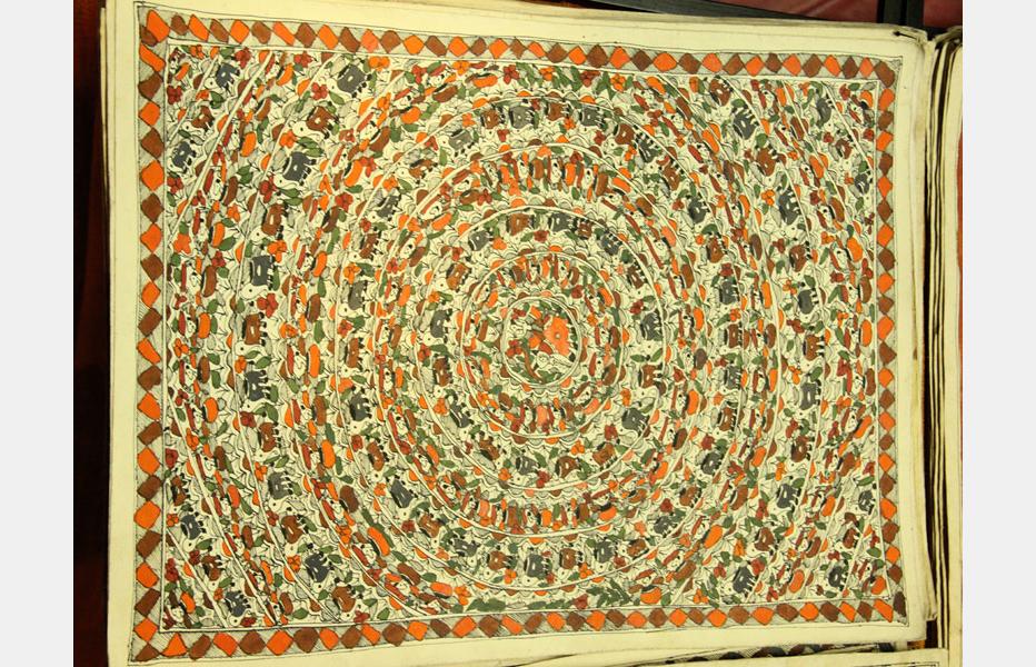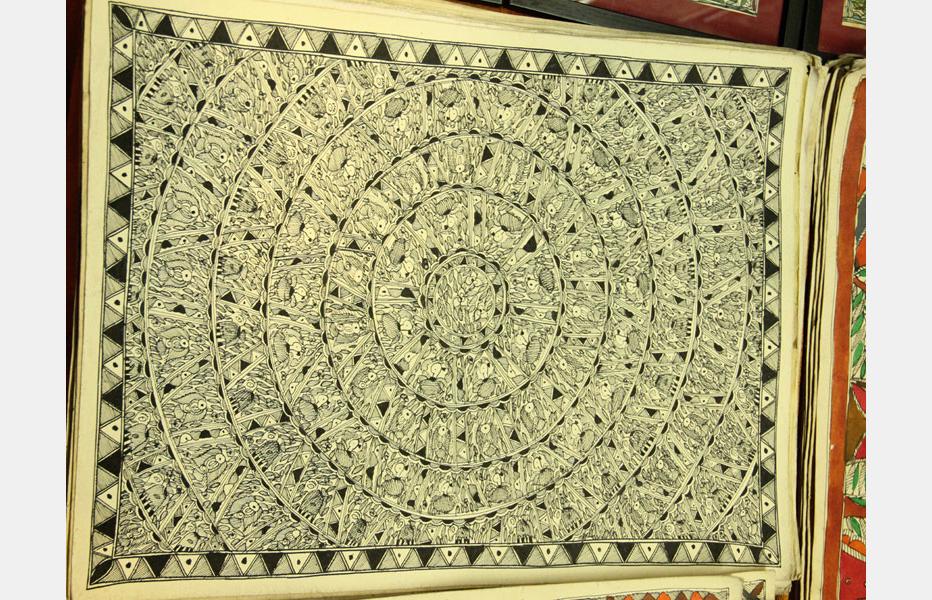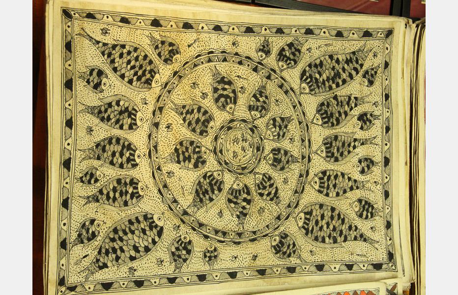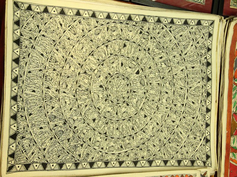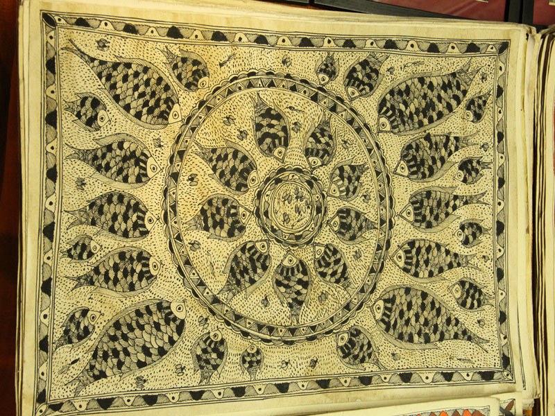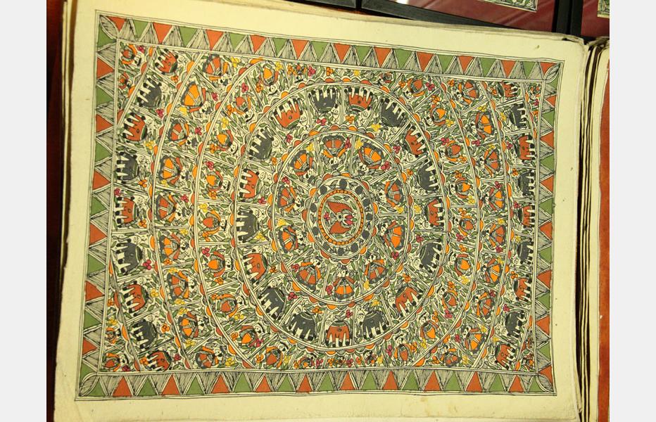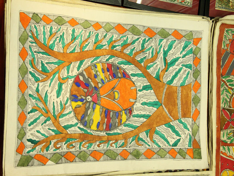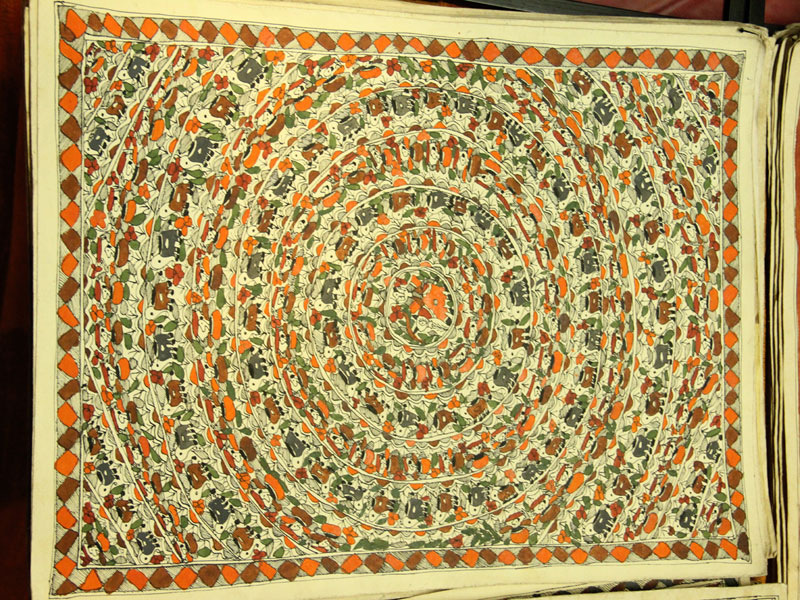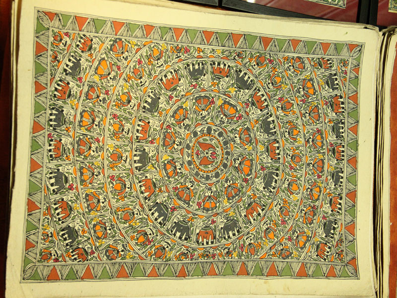 These paintings are from Telangana, Andra Pradesh. Artists in the medieval age used the medium of paintings to convey messages from religious texts. The words of bard and poets were also converted into paintings for the common folk to see. These paintings sometimes ran into scrolls of several meters when depicting a chapter from Indian mythology. Telengana region is particularly well known for its folk paintings, very colourful and bright, that serve as ideal hall hangings. It is believed that the divine architect Vishwakarma handed it down to the artisans on earth. Mostly, the uses colour of folk paintings are red, yellow, green and blue.