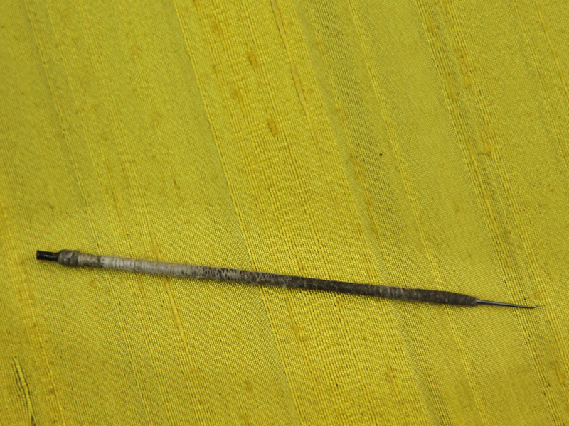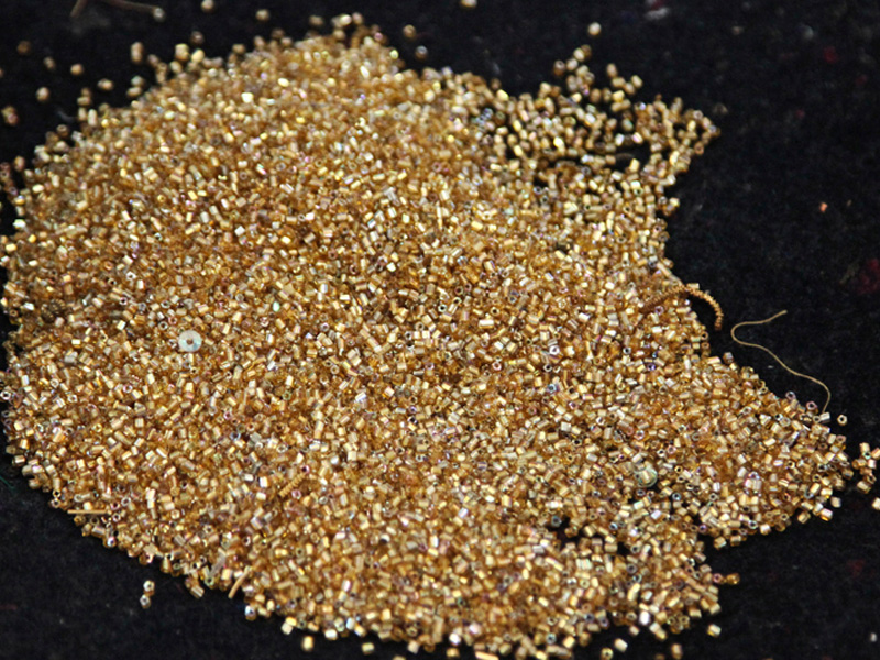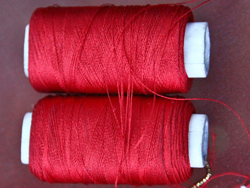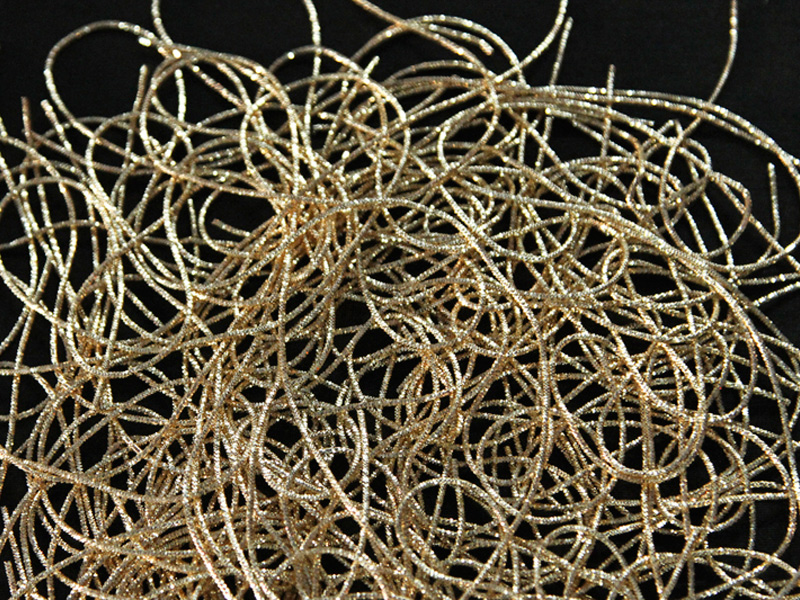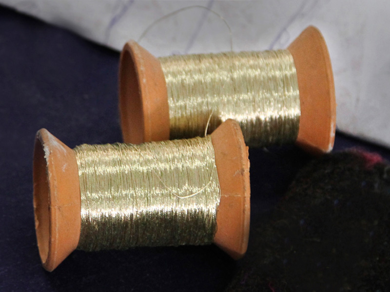 Types of Embroidery Threads used are: Milliary Wire - A two part thread, consisting of a central core wire, with a coiled wire around it. Pearl Purl is a wire that is wound into a tight coil that looks like a strand of gold pearls. Bullion Threads are very fine wire threads wound into a tubular shape, similar to purl threads but tend to stretch. Twists or Torsade thread is made of multiple strands of metal twisted together. Matte Embroidery Cotton - The thickness of matte embroidery cotton comes from a tight twisting of 5-ply thread, which makes this floss eminently suitable for embroidering on heavy fabrics.