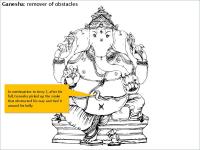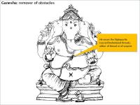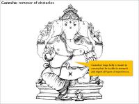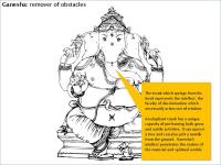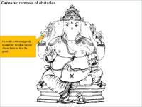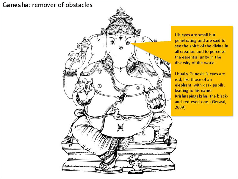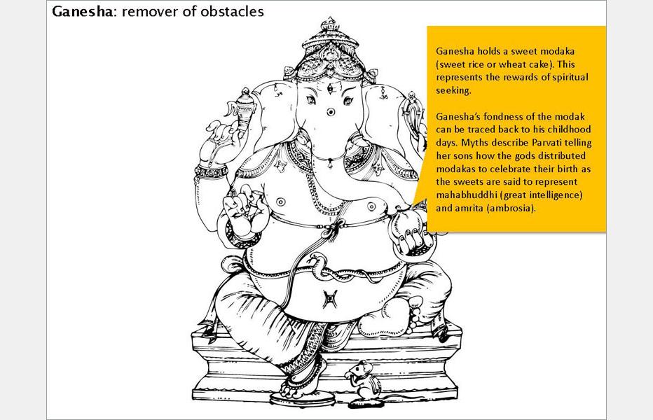Imagery in Hinduism is preserved in its mythology. It is difficult to fully appreciate the iconography of images from the Hindu tradition without identifying with the philosophy behind it. A myth here is not easy to understand, but the code of myth can be broken by symbols. Symbols of a deity make up a pictorial script. Ganesha or Ganpati is the lord of obstacles. The elder son of Shiva and Parvati, he is know by many names some of which are Vinayaka, Vignesvara, Gajānana (one having the head (= ānana) of an elephant (= gaja). Ganesha is worshipped before undertaking any task, as he has the power to remove obstacles. An important from of Ganesha is Mahaganapati. In this form he has ten hands, each holding objects bestowed by ten deities. Among these are the fruit of the citron tree, associated with Shiva, the sugar cane bow, a gift from Kama (god of love), an arrow of a rice shoot, a gift from the earth, Varaha's mace and Vishnu's discus.