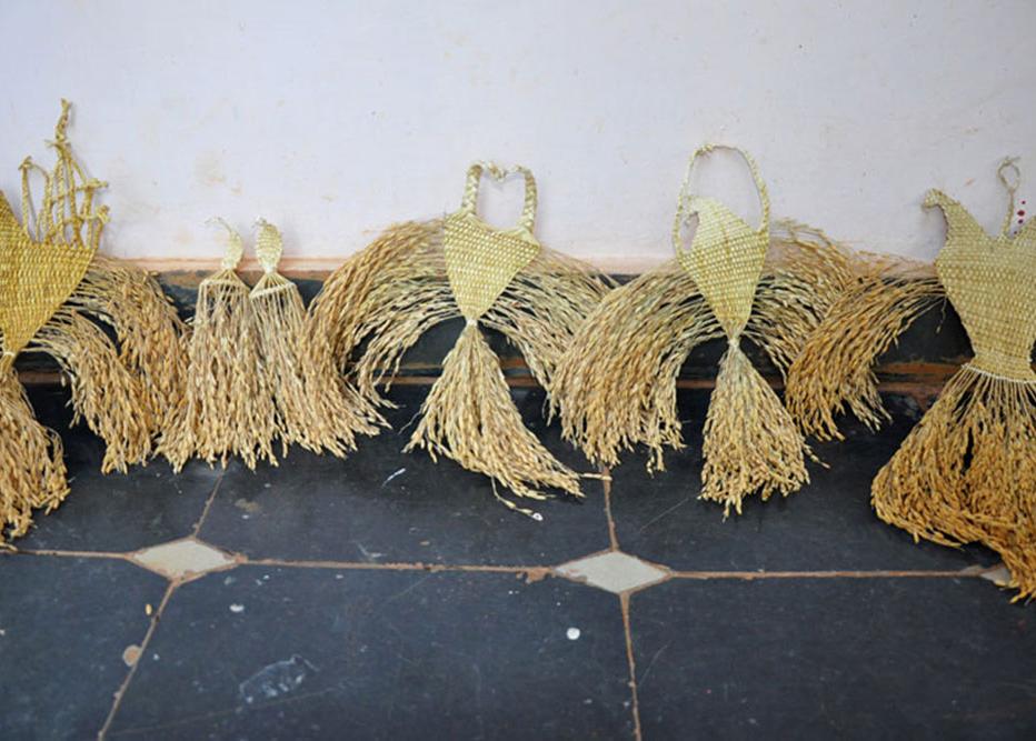 Paddy grain filling are creatively made into interesting decorative items. The finished traditional products are mainly for decorating doors and corridors during festivals and weddings. The life span of final product is 10 years.