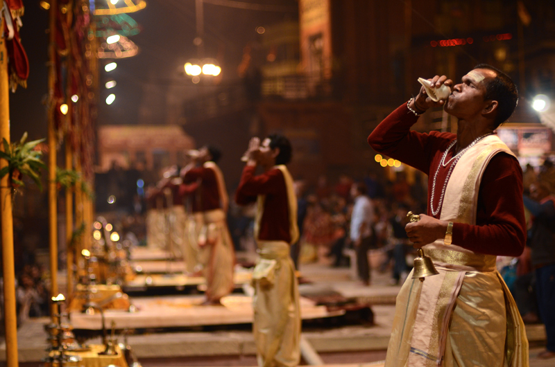 Crowd is gathered on stairs of the Ghats. The whole process, from setting up the stage for evening procession, the final preparations for the prayer ceremony to the Priests performing sacred prayer and ending the prayers with blowing of the conch shell; and at the end people taking blessings from the ‘Aarti’ is simply mesmerizing and worth watching.