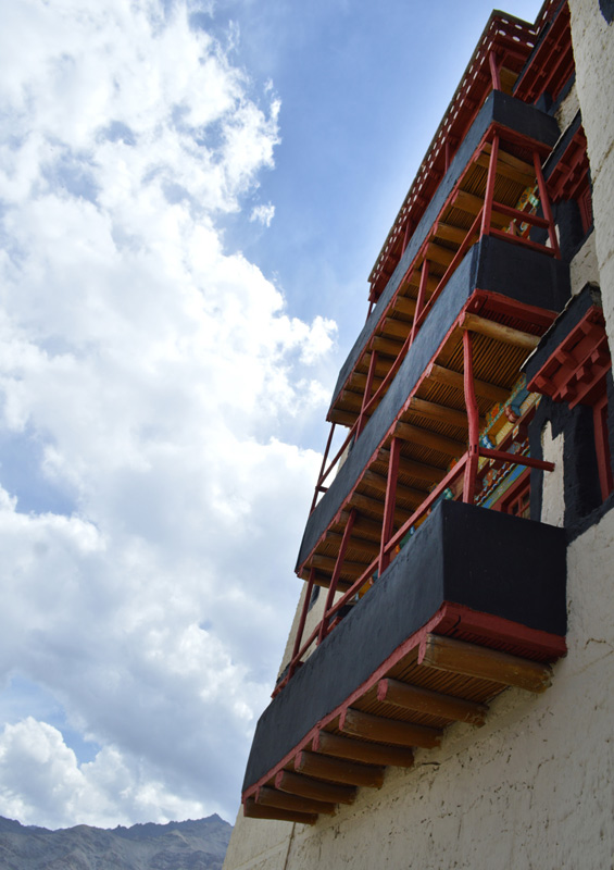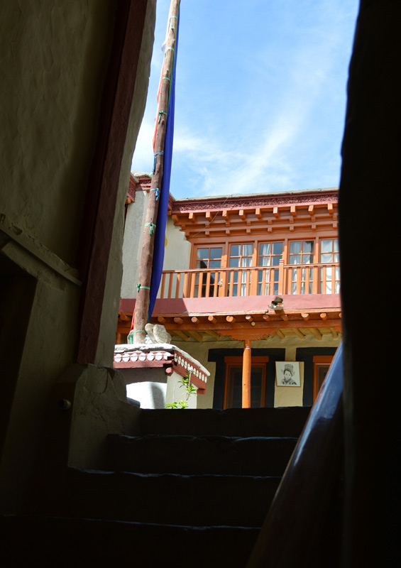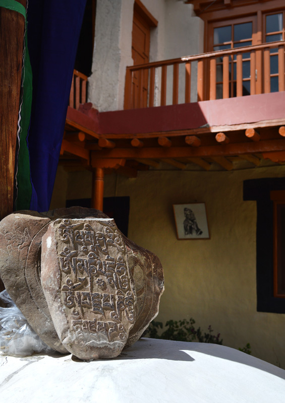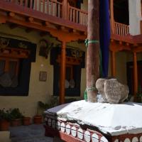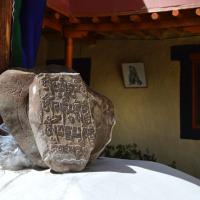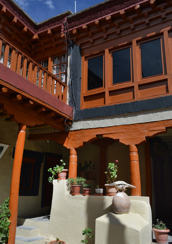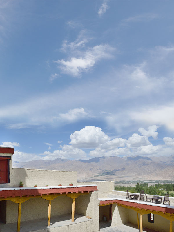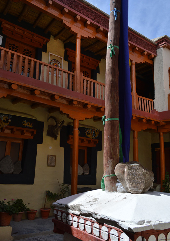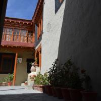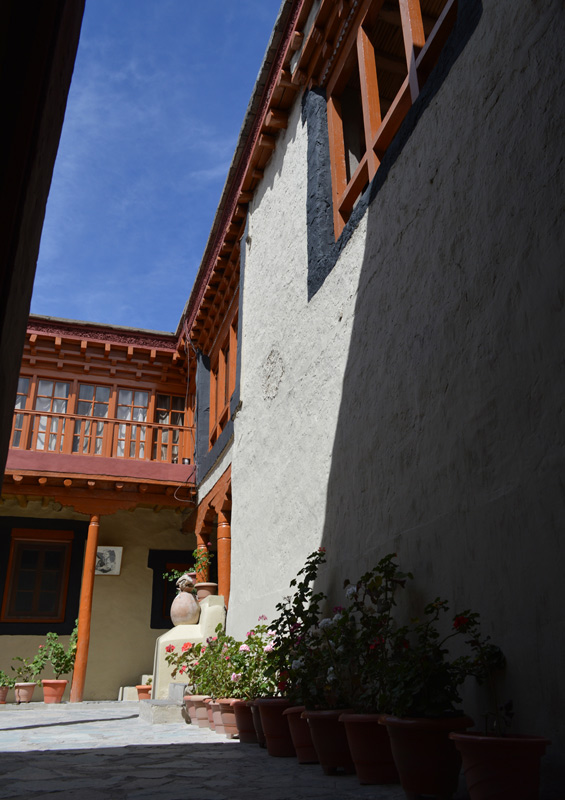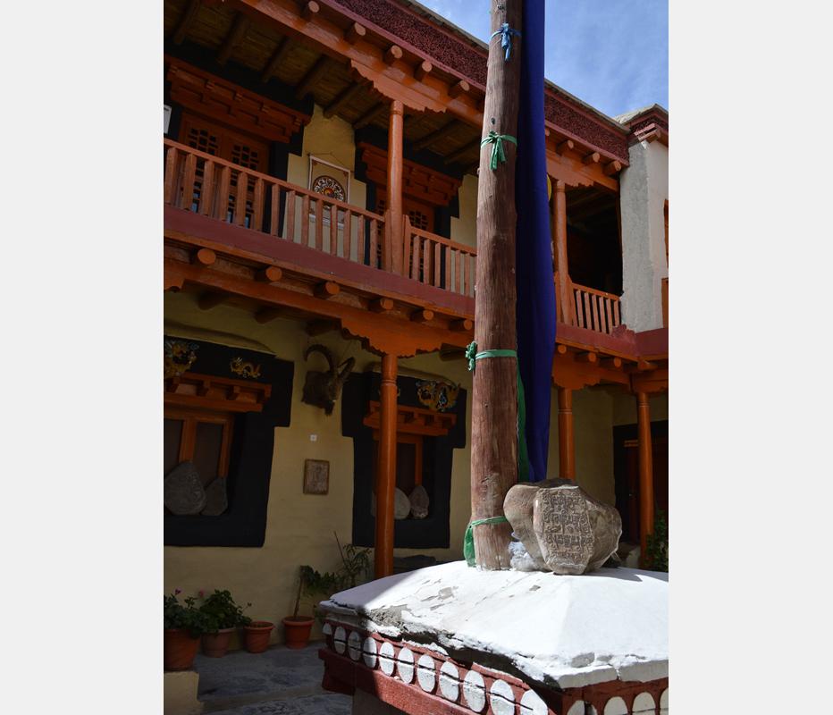 Stok Palace is where the royal family of Ladakh resides permanently. This magnificent structure commands a view over the village of Stok. Painted in the archetypal off-white with traditional windows, it has been beautifully carved and colourfully painted pillars and doorways, leading into the palace. It lends itself to natural simplicity with its earthy palette of colours. The entrance of the palace has inscriptions in the Lansa Script, and to the forefront is a huge stone courtyard enclosed with walls and seating arrangements to one side. Hand painted ethnic doors are present all over the palace. The courtyard has a huge 'dhwaja' or flag installed in the centre. The palace is famous for the collection of ancient and valuable objects of the Ladakhi heritage - like utensils, clothes, jewellery, weapons and currencies - that it houses in the royal families personal museum.