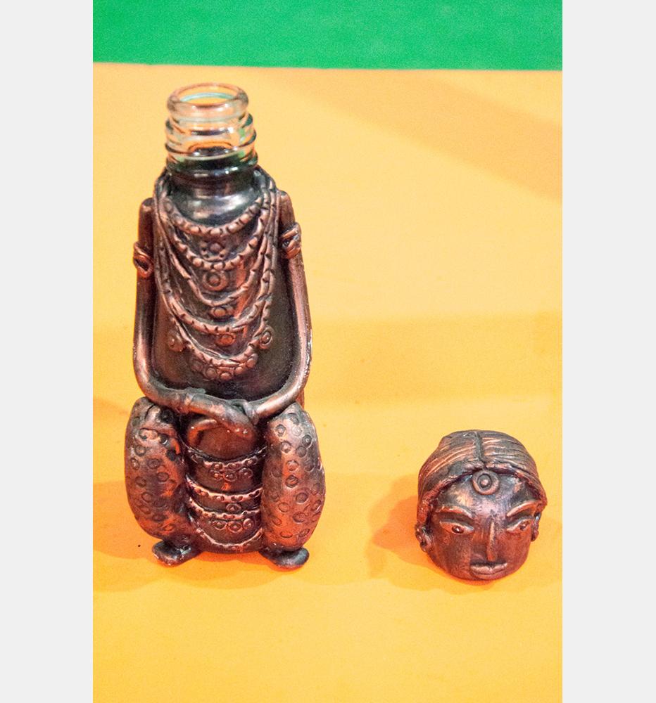 The tribal lady bottle is an innovative artwork made of a small sauce bottle and white M-SEAL. The product is exclusively developed to recognize the importance of our tribal communities who treasures age-old cultures and ethnicities. The bottle holds the shape of a tribal woman dressed in their tribal attire and jewelry. The reason behind the initiative is to exhibit their culture and, in this way, get more people aware of the Maharashtrian tribes. Mrs. Vaishali H. Kawre is an artisan from Nagpur who preserves this unique art. She is the owner cum trainer at the Creative Craft, Nagpur, who runs the art center for 22 years.