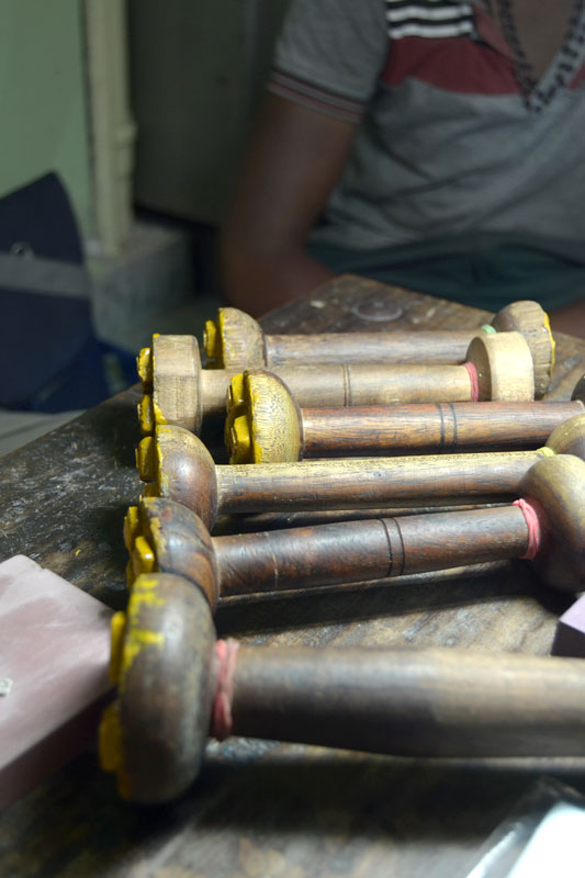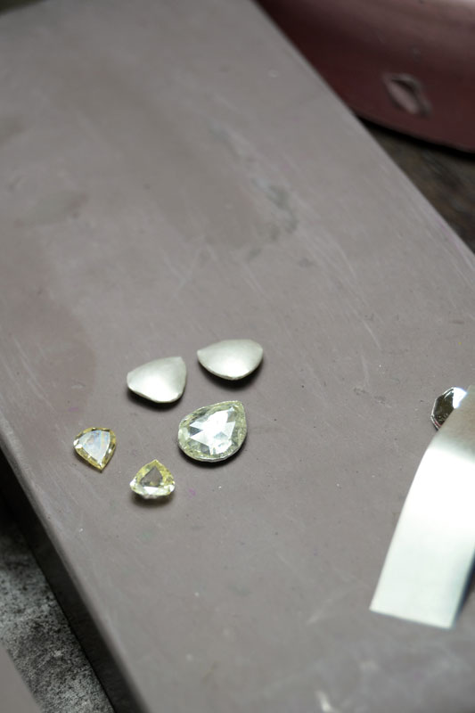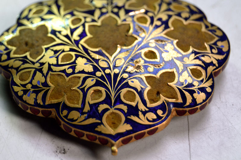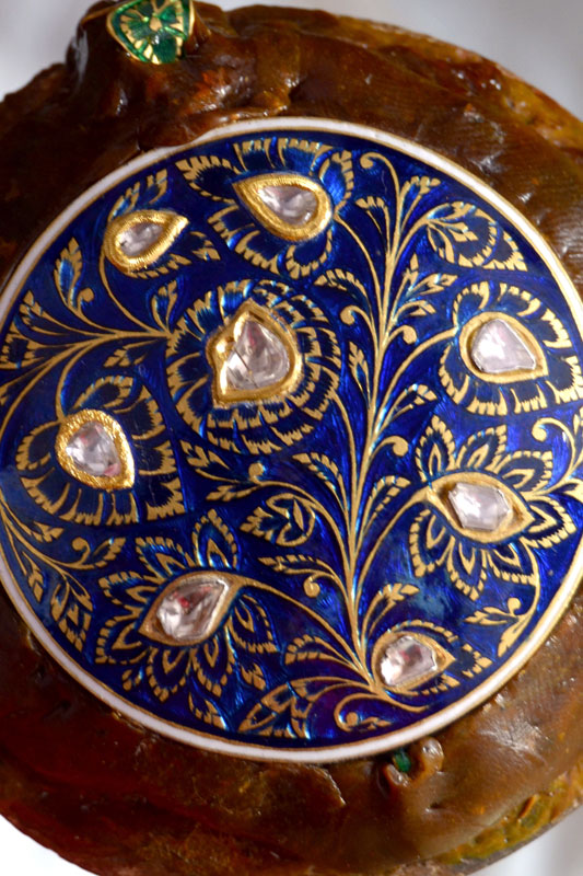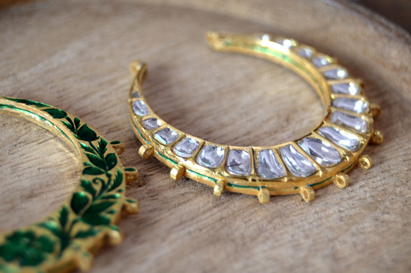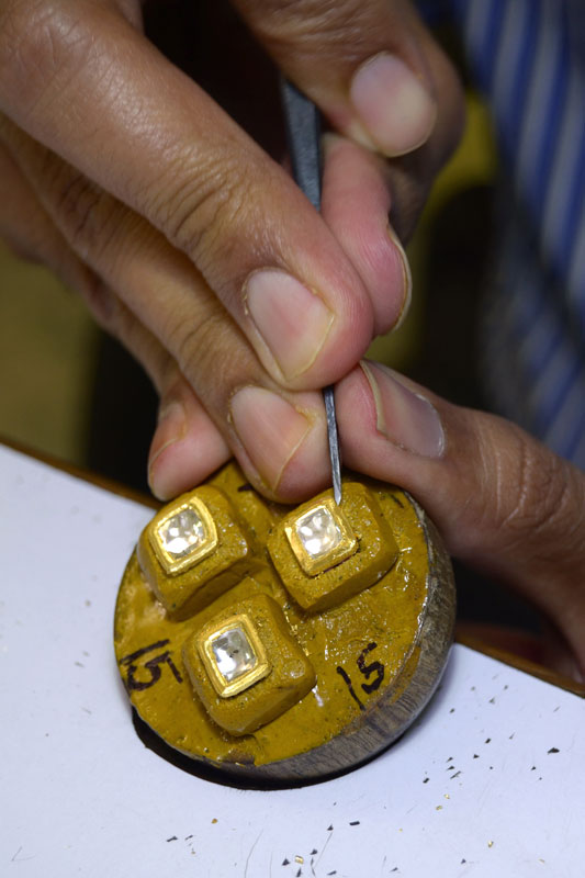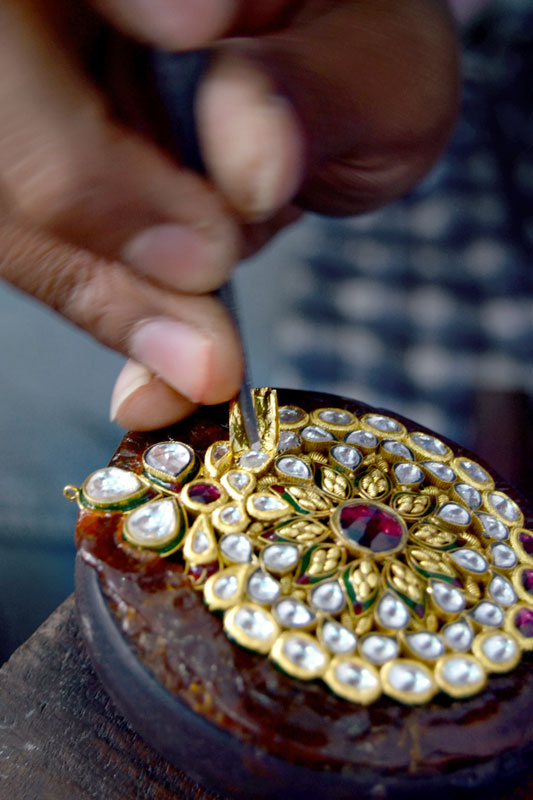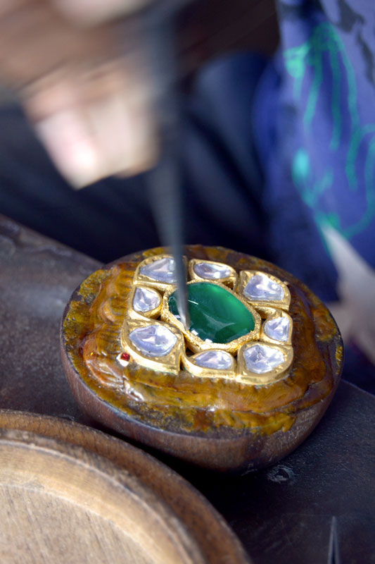 ‘Jadayi’ is the process of gem setting by inserting a gold foil between the stones and their mount. Diamond, sapphire, emerald and ruby are the stones commonly used. To provide depth and refraction, a piece of silver foil is placed under the stones, making them gleam. These are heated and placed on the lac, after which, pieces of 24 carat gold foil (made soft and malleable by hammering) are set into the sides of the gemstones till they grip on tightly.