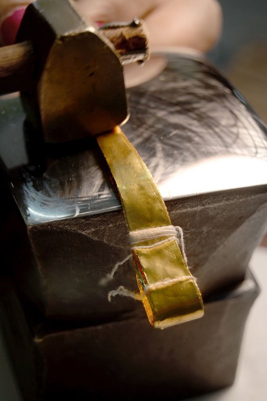 Fine tools are used to chisel the foil at an angle and bring out the fine details of the precious stones, enhancing their beauty. Finally, the ornament is adorned with hanging gems and strung in a wearable thread.