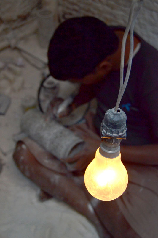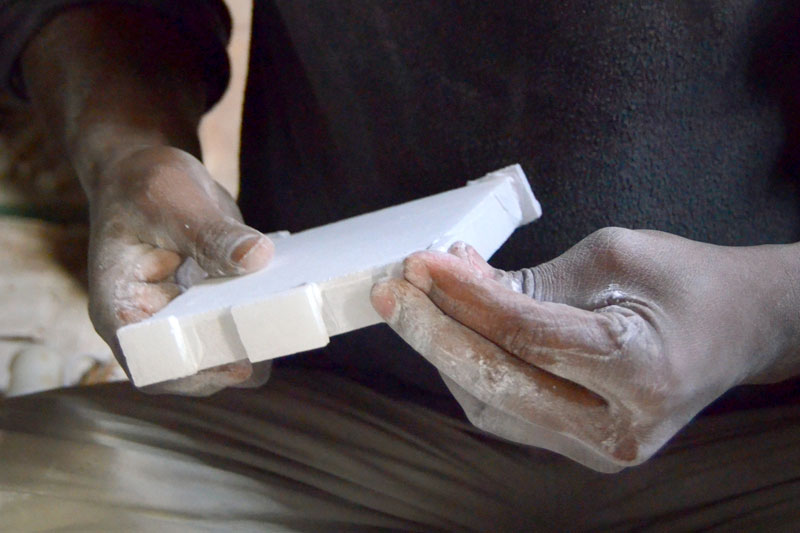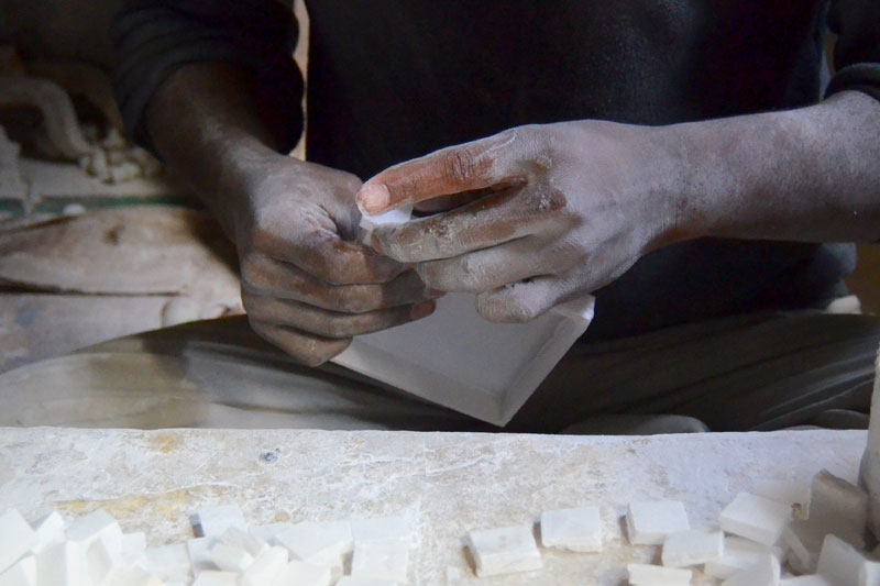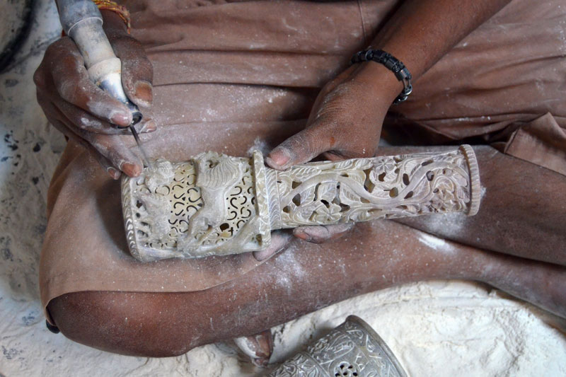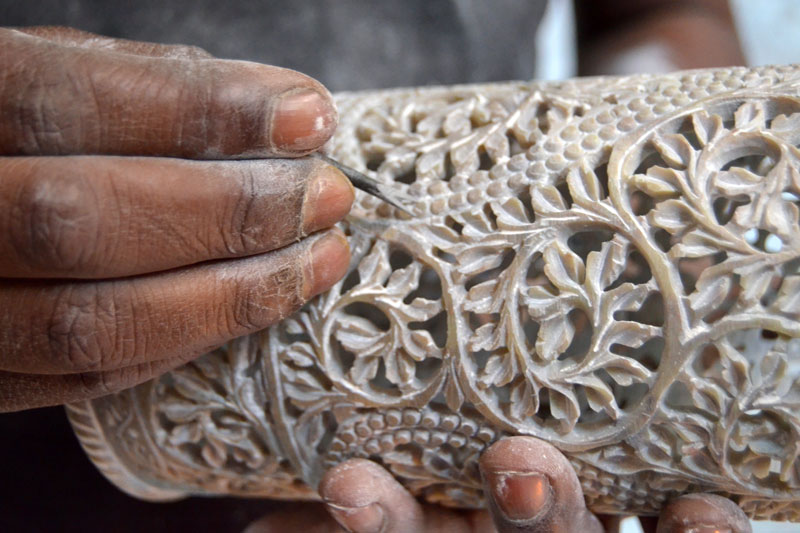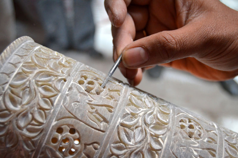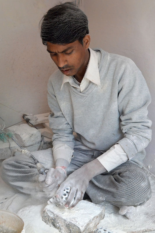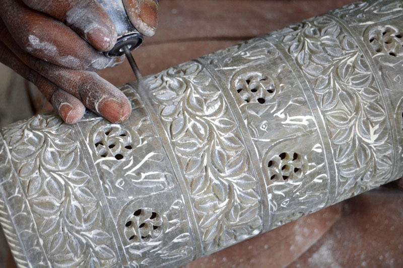 Firstly, rough outlines of the pattern to be carved are etched on the stone as guidelines and basic holes are drilled. Then the fine carving work begins and textural detailsare added. Carving is done using a hand held drilling machine. Though the tool is operated by hand, it runs on a motor. A variety of bits are used depending on the desired intricacy and effect of the jaali work. Different bits, chisels and files are used for drilling, etching, engraving etc. Since the piecesare hollow, the amount of pressure while carving is crucial - a little bit extra and the piece would break.
