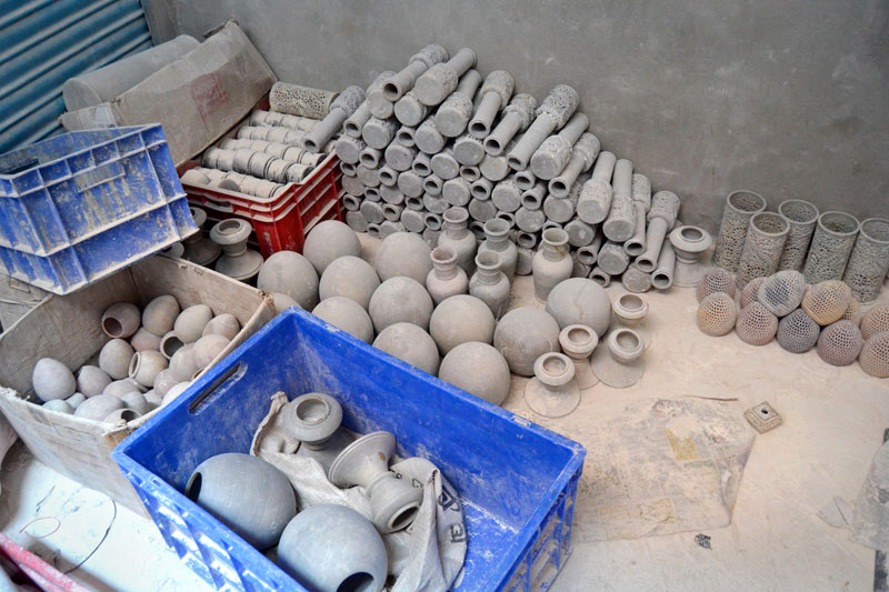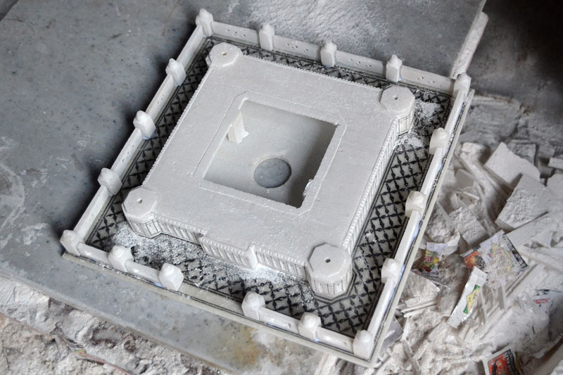 Replicas of the TajMahal sell extensively as souvenirs. These are made in all sizes. About fifteen craftsmen work upon one single piece of the Taj! Its components are usually made dismantle-able. The pieces are cut, carved and then joined with a mix of fevicol and marble dust.The women of the mohalla paint on these.