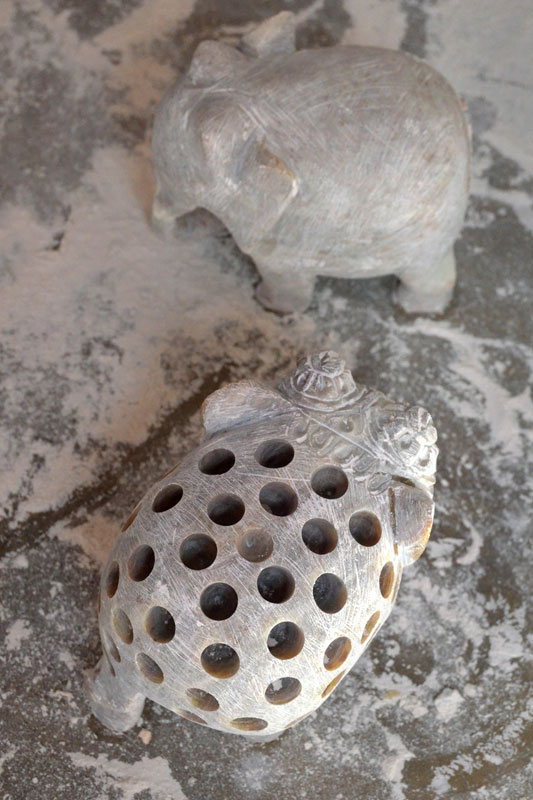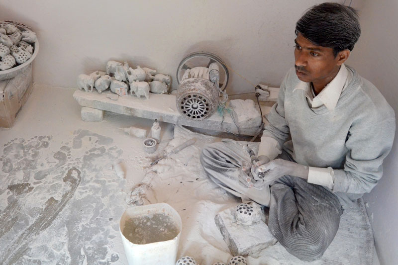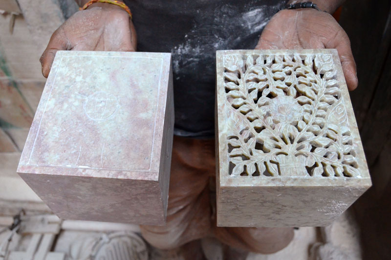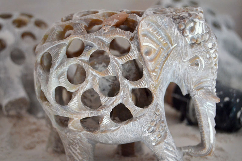 Nesting animals (animals within animals) is a specialtyof the carving experts of Agra but not many people are making these. This is because drilling holes through several layers of solid stone generates too much dust and that harms the lungs. So the craftsmen prefer carving on only one layer of the stone. It produces lesser dust and is also much faster. Precautions like masks, fans to blow away the dust etc. are being taken too.