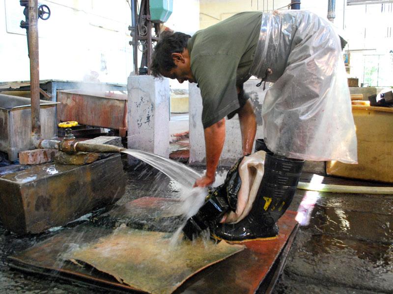 The coloured sarees are clamped in wood fixtures in plastic bags and the border is left exposed. A clamp consists of 4 sarees. The border is dipped in water at 120 degrees and colour is added. This process takes about 15 -30 minutes. The workers wear protective gear such as boots, masks and gloves as the colour is extremely toxic. The sarees are then washed with water to remove excess colour and sent for hydro-extraction.