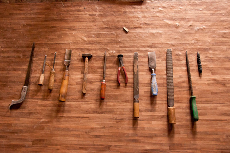 Different types of tools and raw materials are used for cutting and engraving of the wood for sitar making.