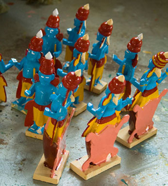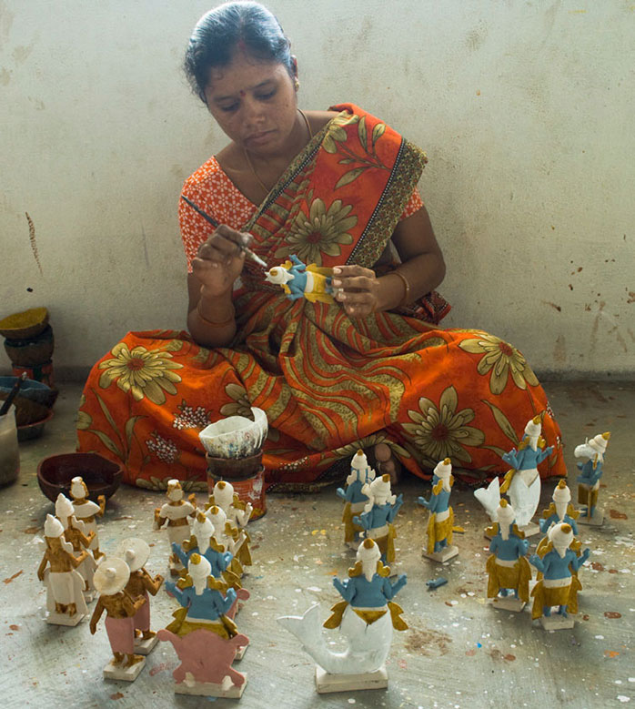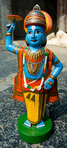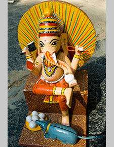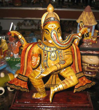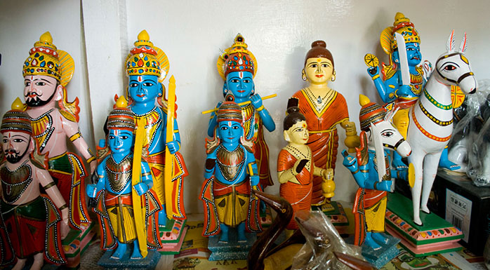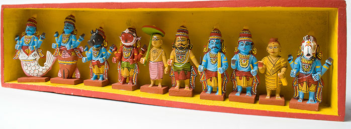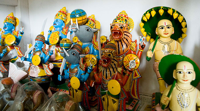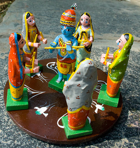 The popular classical collection of mythological figures include events associated with the life of Lord Krishna, the Gitopadesa, Dasavatars (ten incarnations of Lord Vishnu), representations of Lord Ganesha, Lord Shiva and other gods of the Hindu pantheon. The mythological toys pose a great challenge, as they require skill in portraying half-human and half-animal god figures.