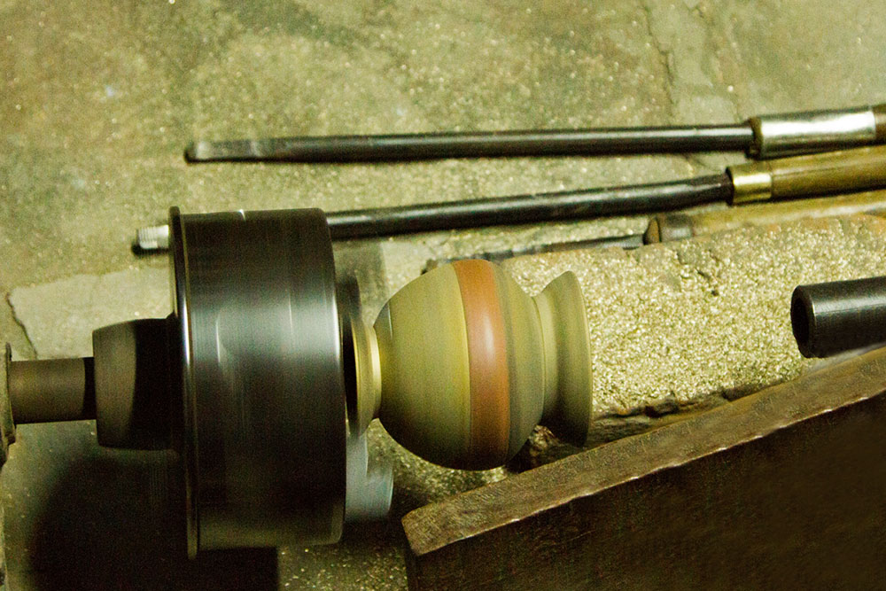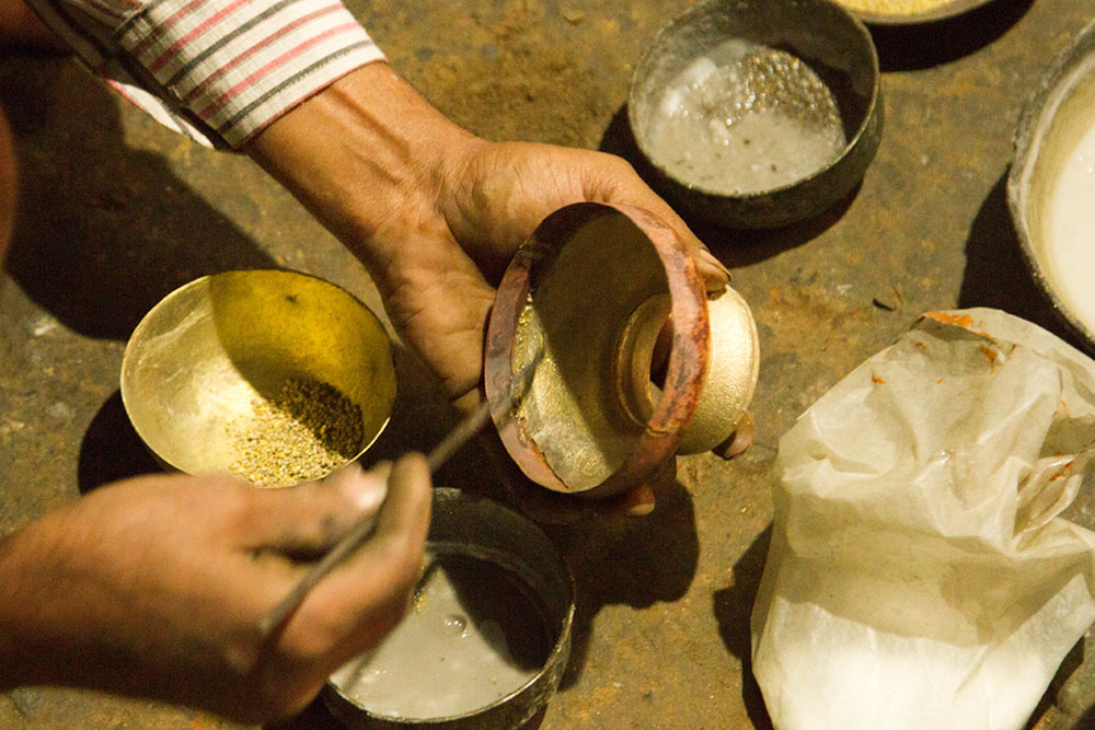 To prepare a brass Kamandalu, initially the scrap brass pieces are allocated and heated in a furnace. The heated brass, which is of liquid form is poured into the pitcher mold and allowed it to form a solid shape. And then the mold is detached from the brass pitcher. Sometimes when the Kamandalu is made in the combination of brass and copper, the top mouth portion and the below portion in the shape of a cup is made of brass using the two different molds. Then the thick copper sheet is cut and welded according to the required measurement and joined in-between the upper and lower parts of the brass Kamandalu. Initially the upper mouth portion of Kamandalu made of brass is fixed to the copper ring by hammering it and shaping it. The gap between the brass and copper is filled by painting the liquid mixer of brass powder and brazing flux powder as a binding agent and heated in the furnace. Once the Kamandalu’s middle portion of copper and the top brass portion of Kamandalu is attached firmly by fixing and heating, it is allowed to cool for some time. Then the down brass part of Kamandalu is attached in the same way to the other side of the copper and heated in furnace and cooled. When it is only the brass Kamandalu then once the pitcher mold is taken, it is allowed for cooling and then it is neatly polished by the polishing machine. After the pitcher is ready a hole is made according to the requirement, in the area where the snout has to be attached. A brass snout is also made by using a mold and is polished. And then it is attached to the pitcher and the mixer of brass powder and brazing flux powder is applied and heated and then buffed completely. A thick sheet of brass is cut accordingly and attached in a semicircular manner at the mouth of the Kamandalu’s either sides as a handle. Thus the traditional brass Kamandalu is prepared and sold at Varanasi.