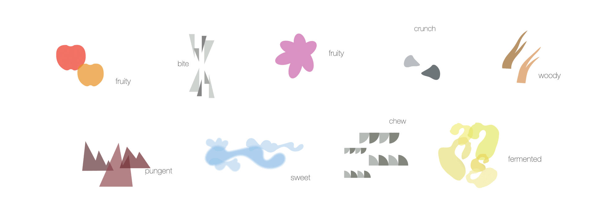 The visualisation aims to map the following aspects of food - its taste, its smell, its colour, its texture and the process of eating food.