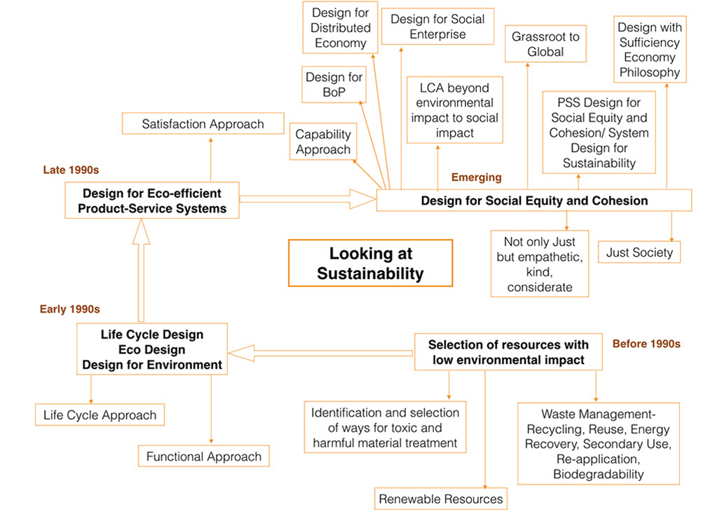 Now design research in the West is opening up a dialogue on the possible role of design for social equity and cohesion as part of DfS [26, 29-39]. But a literature research into design reveals that questions of social responsibility of designers and design is not new. They had been emphasised even during the 70s [40, 41] and more so in the East. Some of these contributions were disseminated before the concepts of sustainable development was introduced in the late 1980s.
