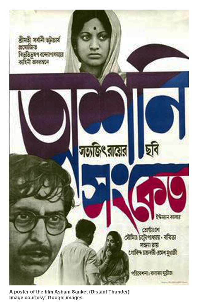 This poster was made for the 1973 Bengali movie Ashani Sanket. This film was based on the Bibhutibhushan Bandopadhyay novel of the same name, directed by Satyajit Ray. Ashani Sanket was shot in colour, unlike the majority of Ray's earlier pictures. In addition to Bangladeshi actress Bobita, who appears in just one notable international part, the picture also stars Soumitra Chatterjee, who has starred in several Ray films. Currently, The New York Times Guide to the Best 1,000 Movies Ever Made includes the movie. Theatre diva Mrityunjay Sil made his stage entrance.