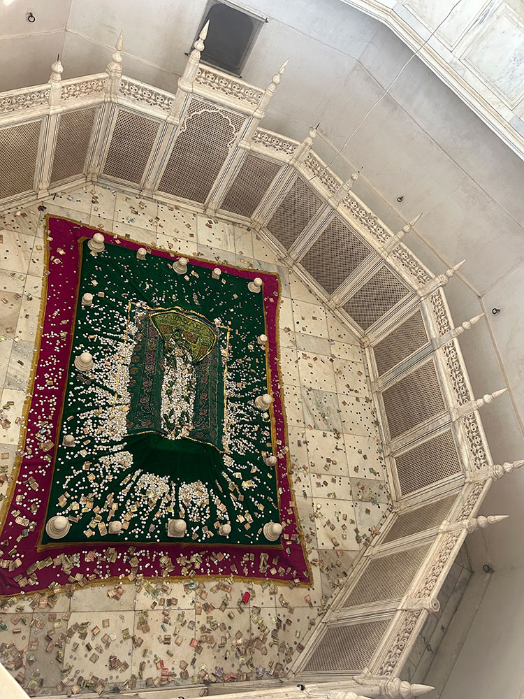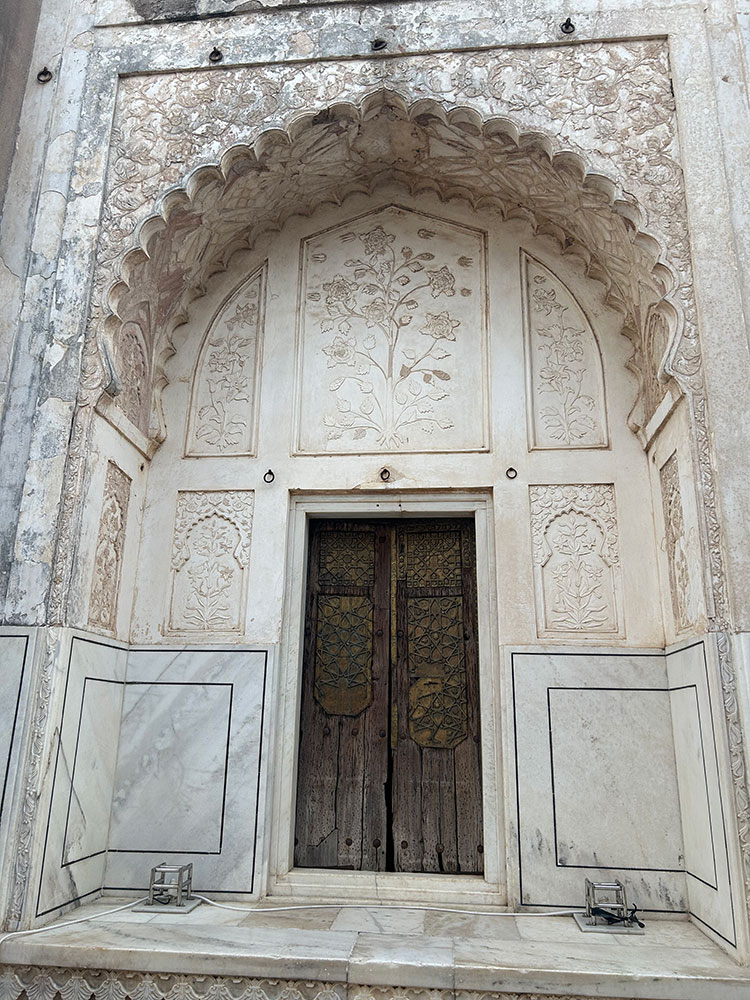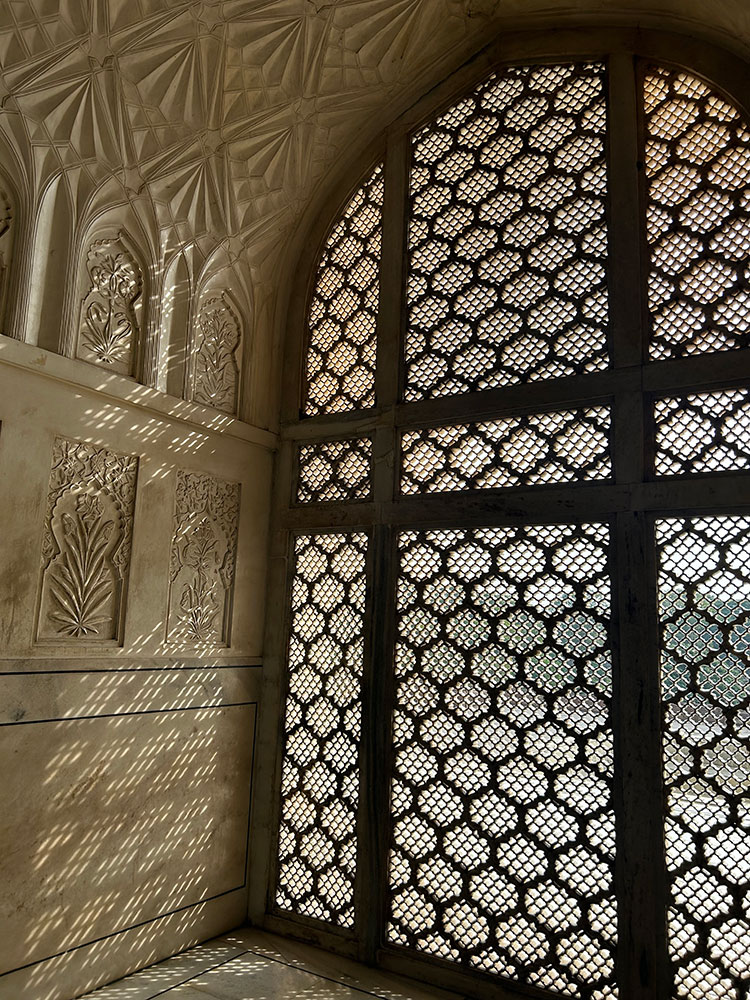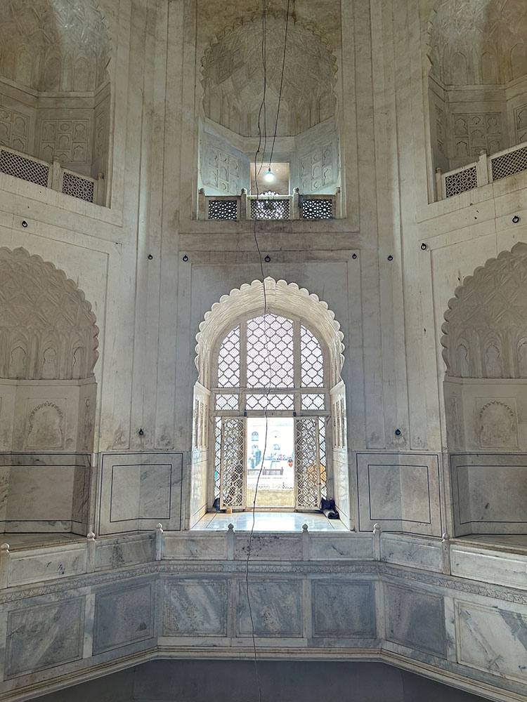 The grave of Rabia-ud-daurani is enclosed by an octagonal screen made by delicately carved marble.