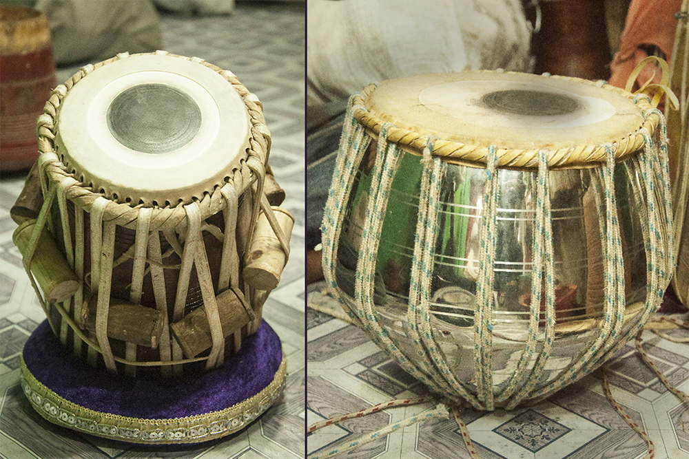 Carved Drums of Tabala on the left and metal drum - part of Bayan.