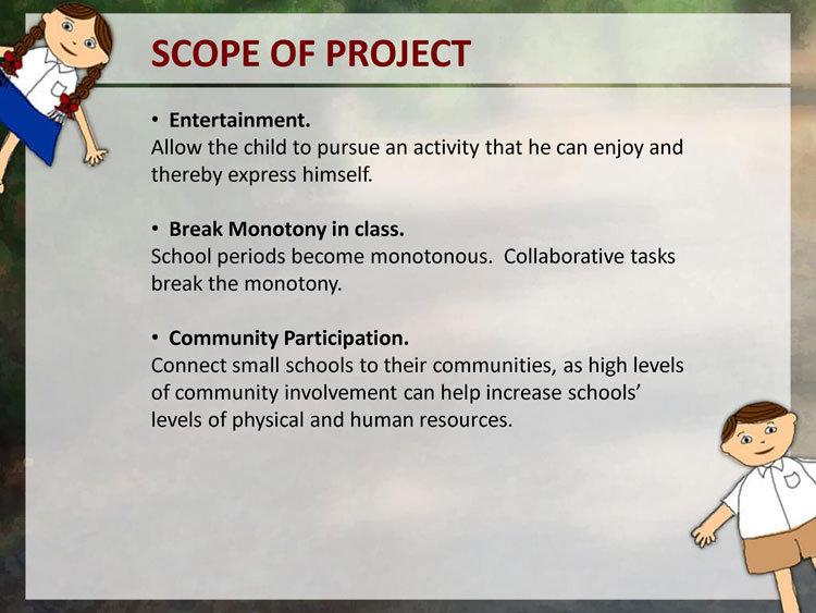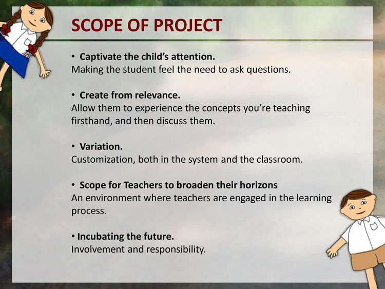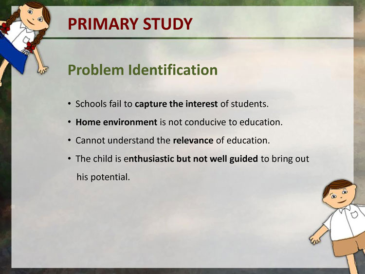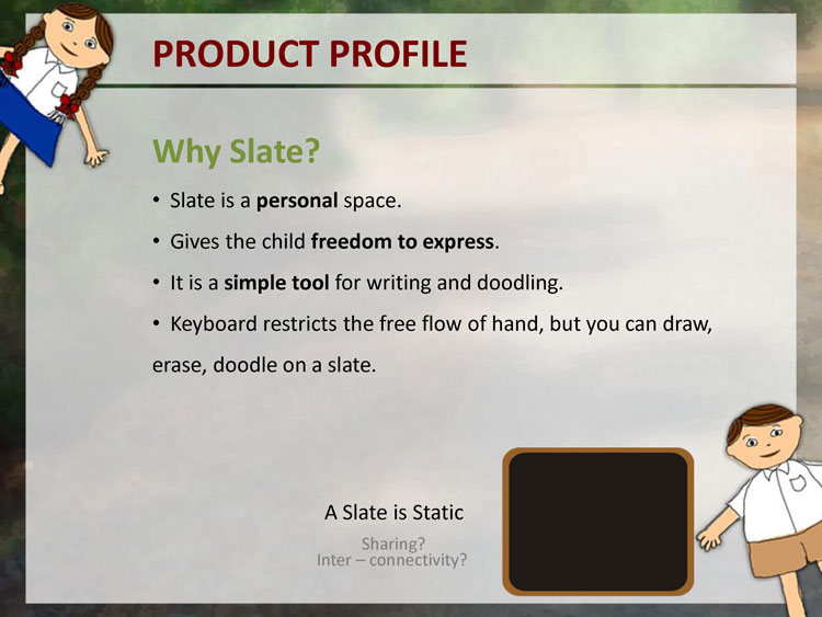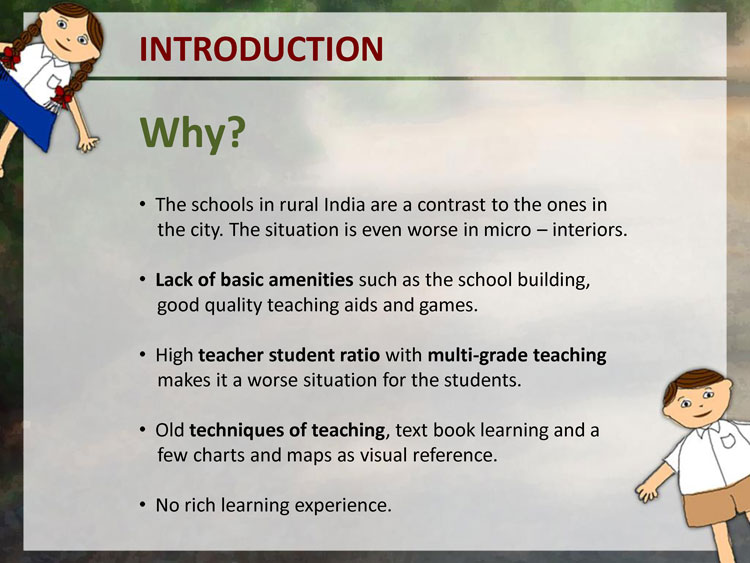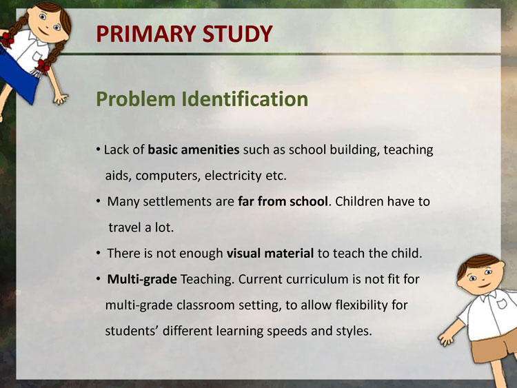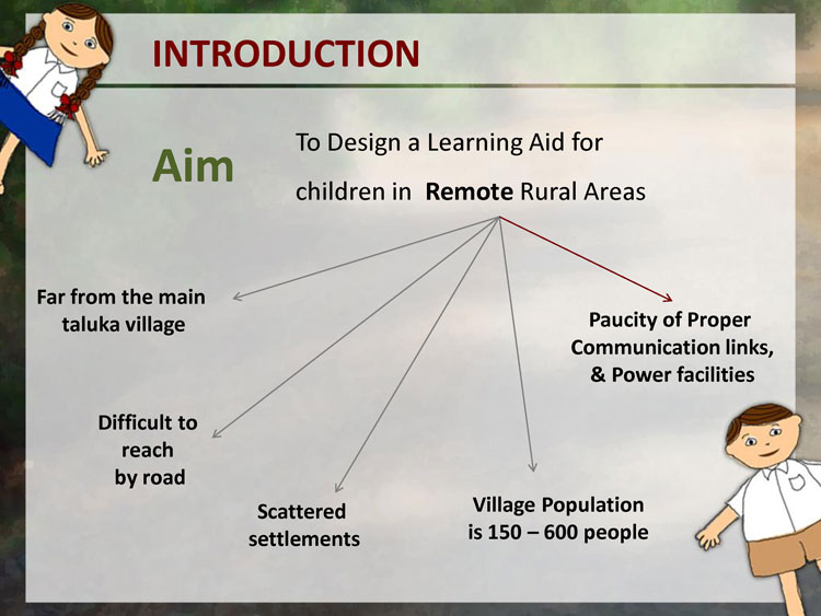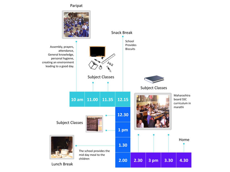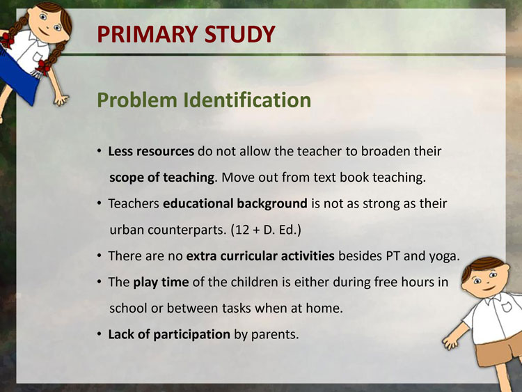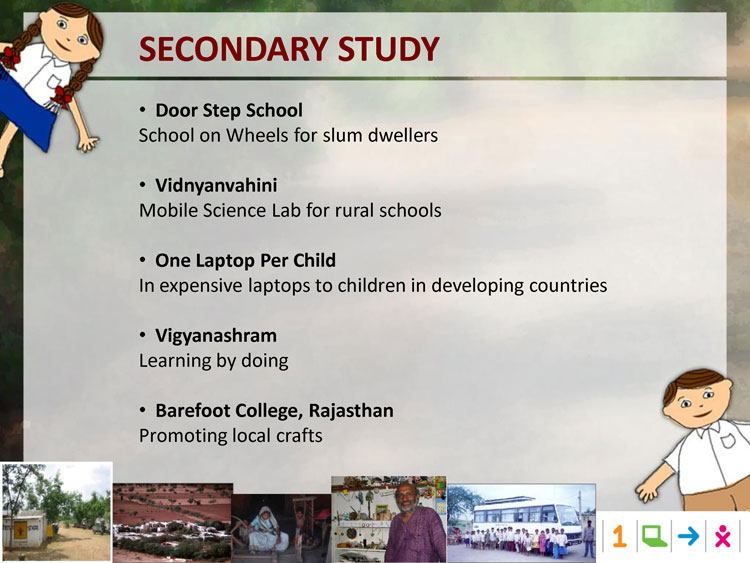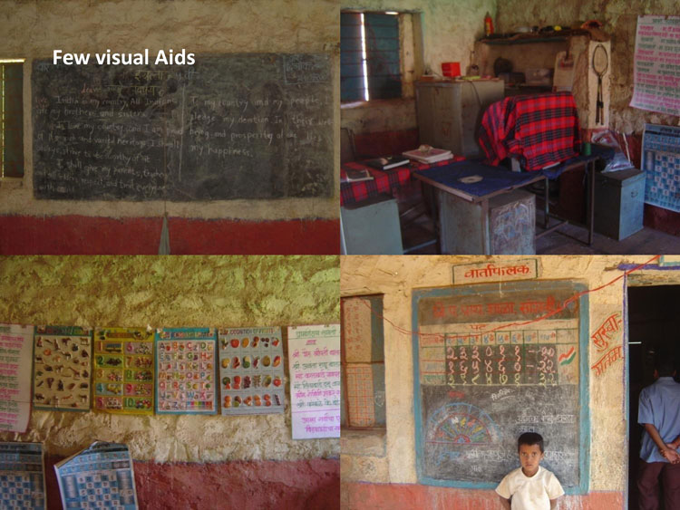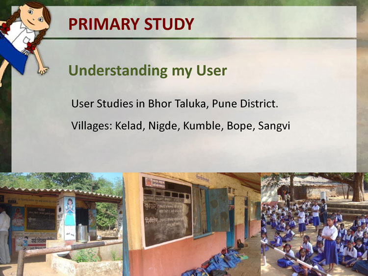A primary data collection in form of user studies was done to understand the users. Observation of Education was done in few remove village schools in Pune District. The user studies included visits to schools, observing the learning and teaching process, talking to teachers, visiting the homes of a few students, talking to the parents and the children themselves.