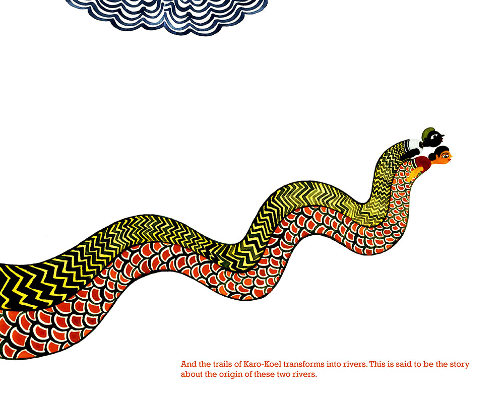This book is about an illustration of one of the story narrated by Smt. Dewla Hansda. The story is about a origin of the two rivers Karo- Koel of Jharkhand. It's a myth that these rivers are brother and sister. Karo is a boy and Koel is a girl. Folklores play an important role in understanding the culture and tradition of the group of a people and illustrations can enhance the beauty of a folklores.