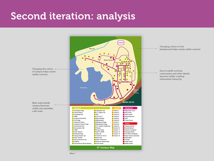 In this iteration, the landmass of campus does not stand out like an individual shape. Instead, you will notice the roads and numbers in the foreground. The landmass is now in the background. This is what we meant by stark versus subtle contrast. It helps you highlight certain things, it creates an information hierarchy.