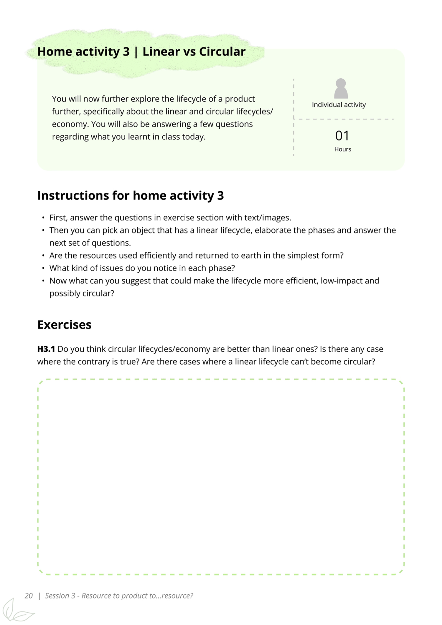 Let's talk about the activities. We have three kinds of activities- class, home and long activities: