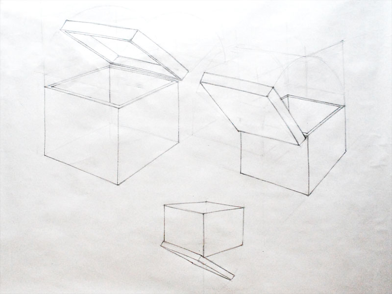 • Draw these Treasure Boxes to begin with. Notice the ellipsoidal reference lines along the edges of the cube, to correctly draw the open lid.
