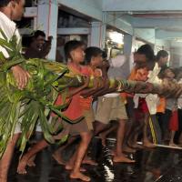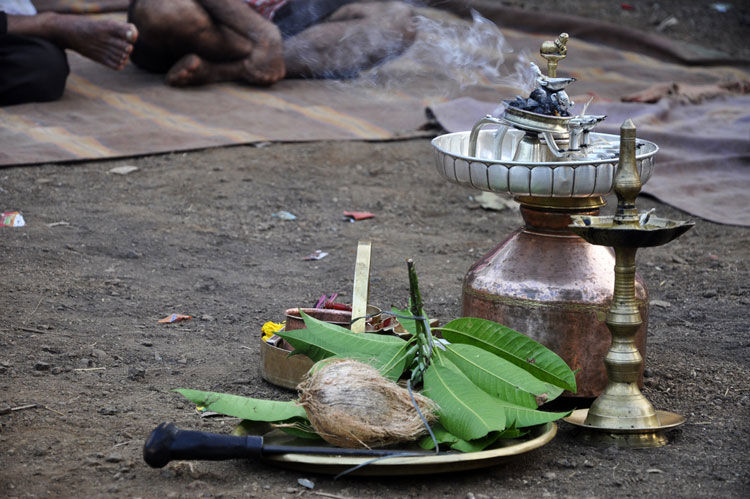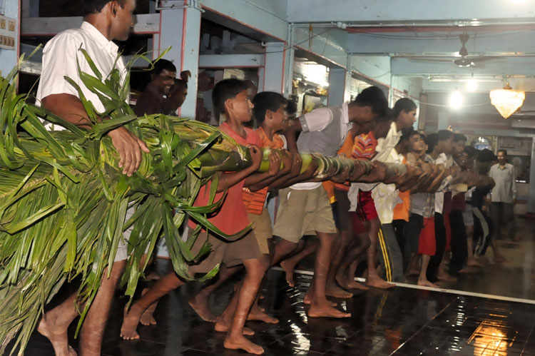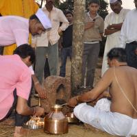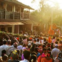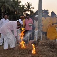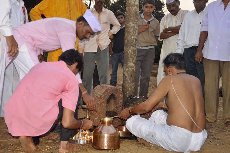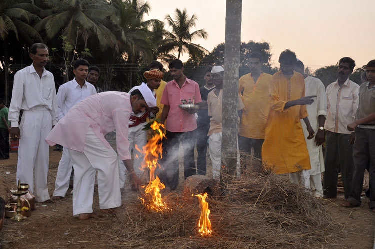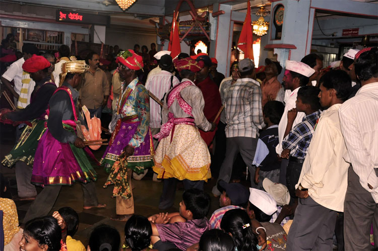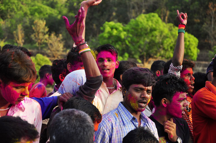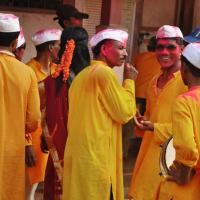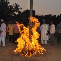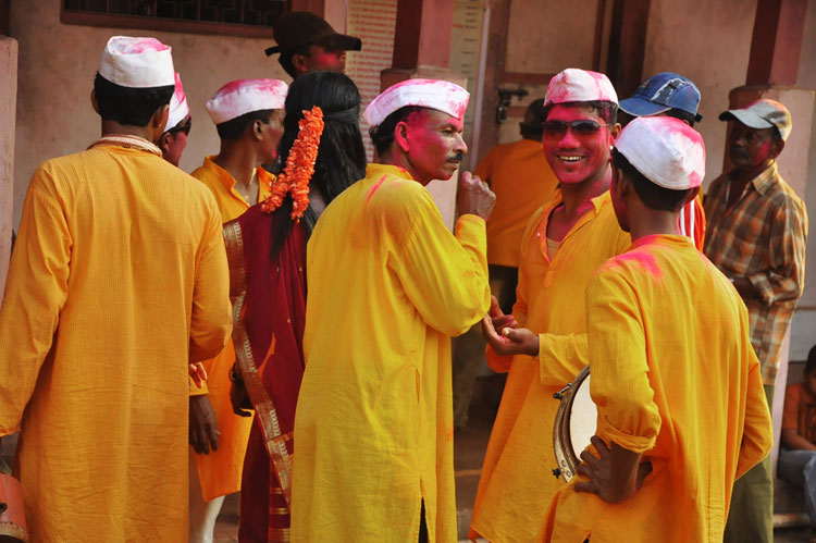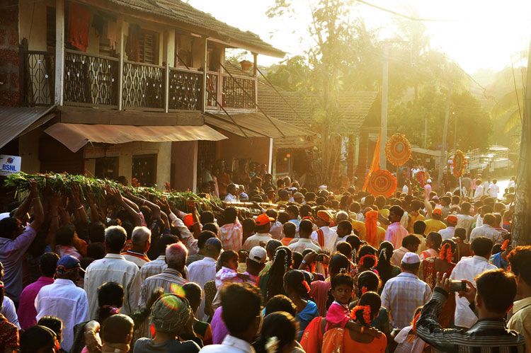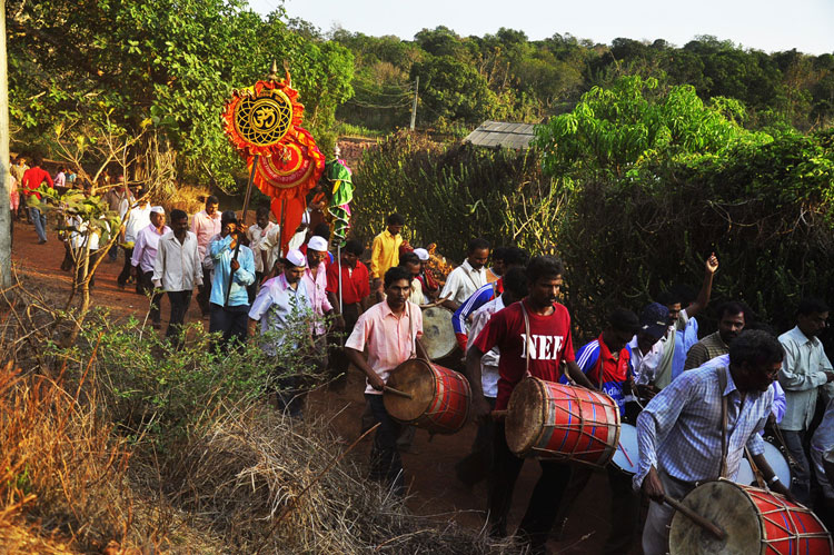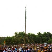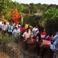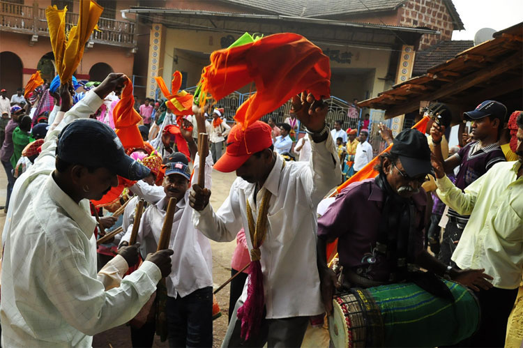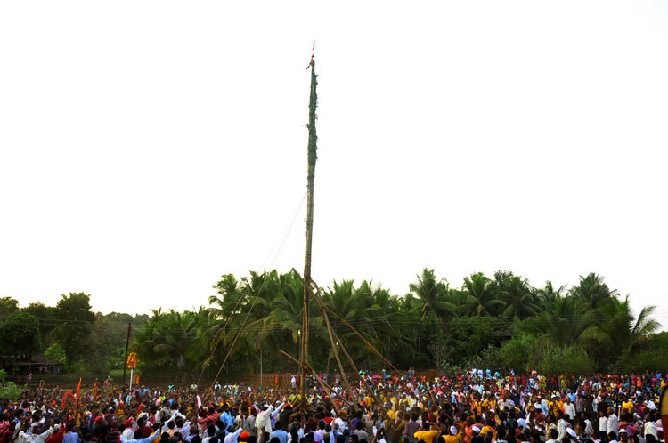 The festival of Holi actually starts the night before with a bonfire made up of all the dried leaves and branches. The heat from the fire is also a reminder that winter is behind and that the hot summer days are ahead. Metaphorically though, the fire is meant to signify the destruction of evil - the burning of the ‘Holika’ - a mythological character. Days before the actual Holi begins, people start preparing for various rituals and customs at Adiware, Vadapeth which is made up of fourteen small villages called Vada situated near the beautiful coast line of Maharashtra. People from these villages gather at Mahakali Temple to perform in front of Devi Mahakali. These performances called Khele which is based on the martial art transformed into dance. Through out the night on full moon people dance and sway with the five areca palm tree called onde kept on the steps of Mahakali temple. On the day of Holi, all Khot meet at the temple in the early afternoon and put gulaal on devi which is the sign of celebration to start. With all acoustic music and dance, everyone with coloured faces get ready to take Holi which is the areca palm tree from specified vada. With the immense enthusiasm and with holy heart, everyone enjoy their participation to carry the areca palm to the place where it gets erected. The khot comes and burn the hay around the erected palm tree and the celebration with color start from that day.