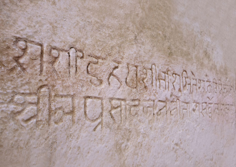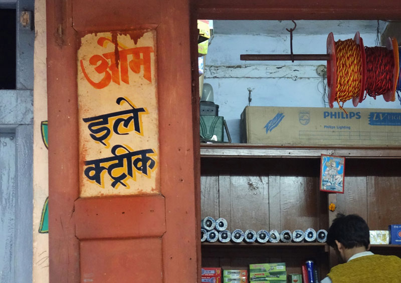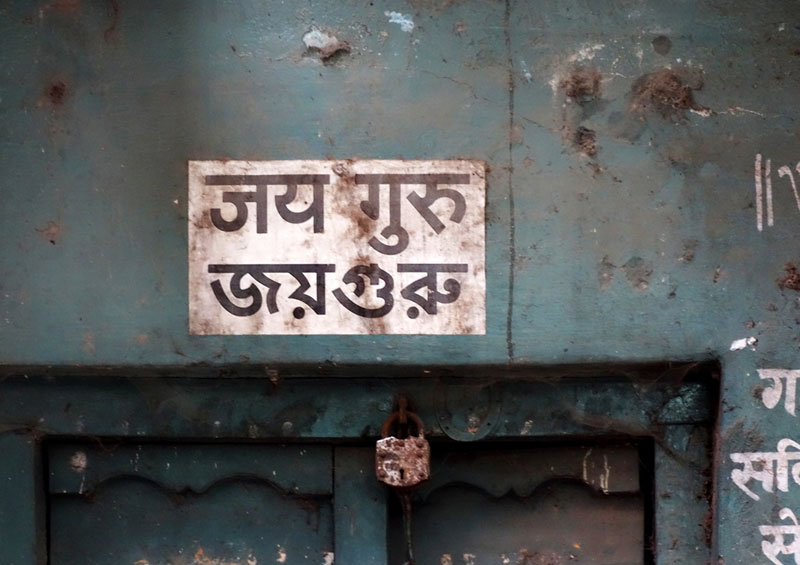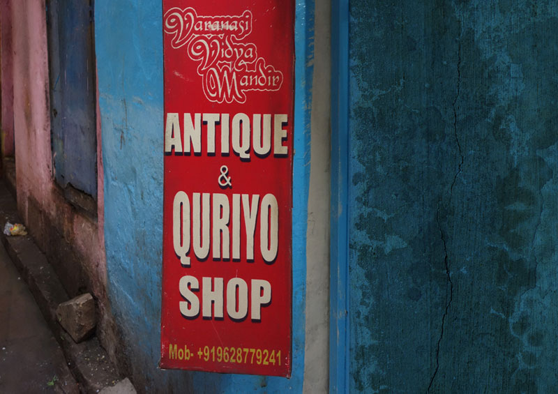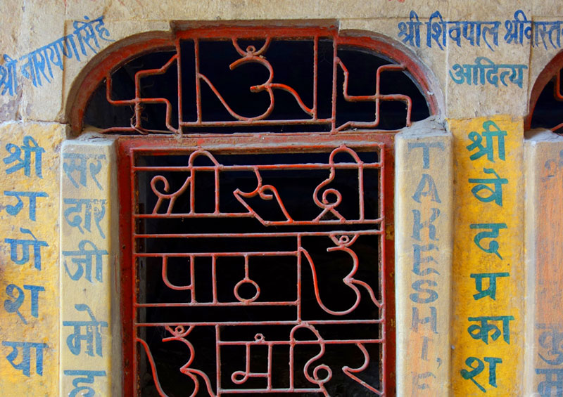 Confidently painted 'mistakes' like 'Quriyo aka 'Curio' and conveniently labelled shops, doha's deeply etched into walls, or metal grills bearing the name of the temple are all contributors to the beautiful hand done typography visible in all parts of Varanasi. From an artistic viewpoint it is intresting to see how this typography has imbibed some part of the surface it was written on, or how a material like iron has been manipulated carefully to create words. Even sand and cemented walls are not spared when a sholka or quote has been carefully etched into its surface, gaining readibilty over time due to the settled dust within its crevices.
