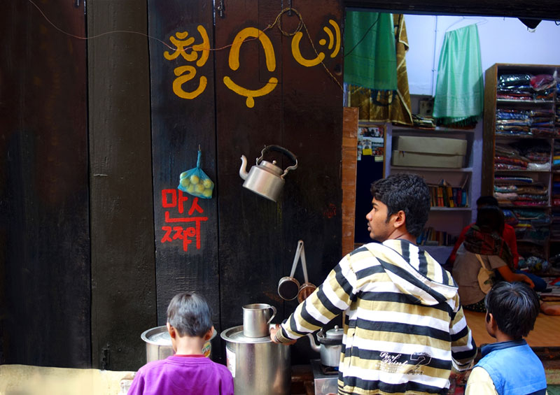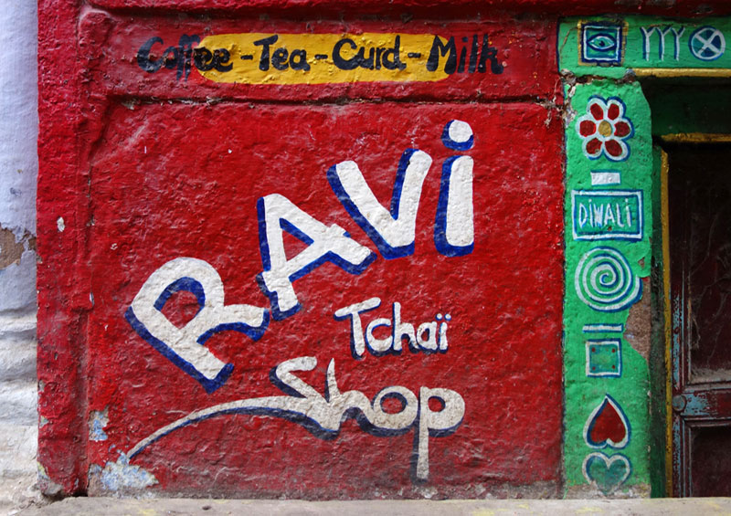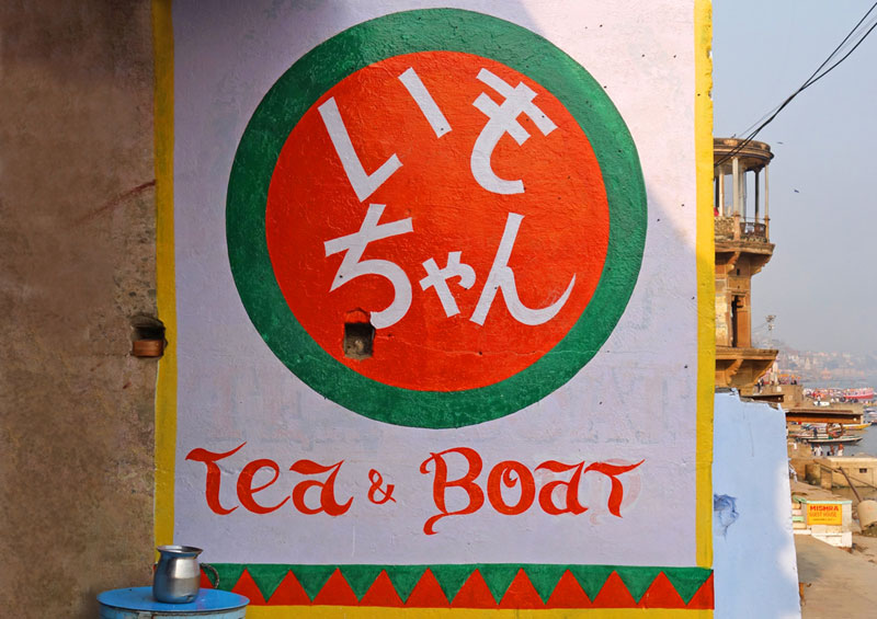 The purpose of a sign or a notice is to attract the public hence they may be complex or detailed, or for convenience be painted in a specific regional language in order to attract only a certain segment of people. Peoples relation with words, and how they connect with them can be seen when 'chai' is written as 'tchai', or for instance when a simple teashop on the ghats is labelled aptly by Korean tourists as 'Tea and Boat'. Words become visuals, they become sounds, they become the carriers of culture.
