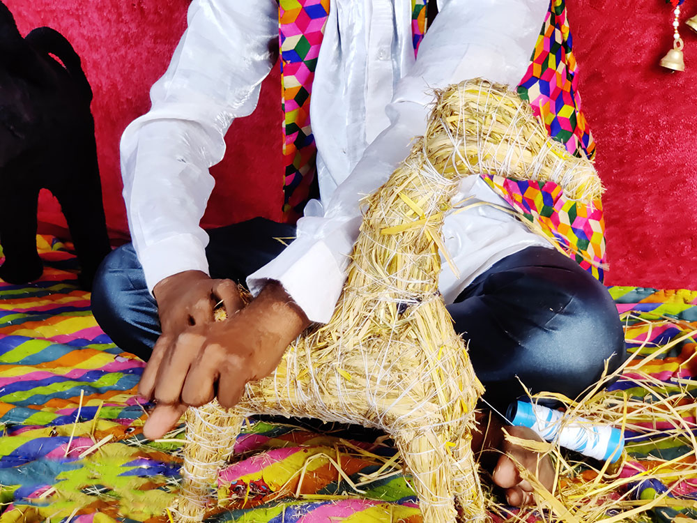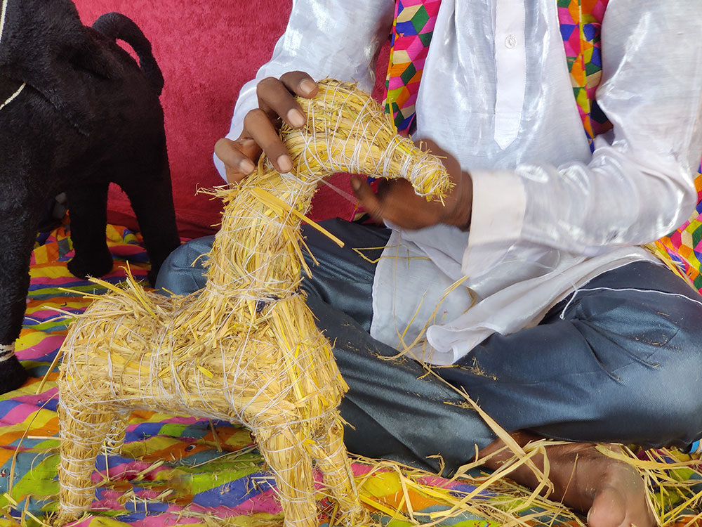 The very first step for making animal puppets is cutting bamboo sticks and joining them together to make a basic body structure. A dried husk is used and tied with thread on the bamboo structure to give the body shape. Once the basic body shape is formed, it is covered with fabric. Different types of colourful cloths are used to cover the body structure of the animal. The fabric is stitched with a needle and thread.