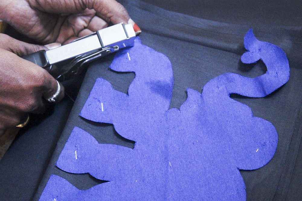 To make the motifs, the designs are sketched on the newspaper or some kind of plain paper. After sketching, the designs are cut out of paper by using scissors. Once the design is ready, the colour and fabric for the design are chosen, and it is folded into layers to make multiple pieces at a time, which are used repeatedly on the cloth pillar. The fabric is folded in such a way that it is slightly larger than the design to be cut. The paper cut out is stapled onto the folded cloth placing in the center. Once the designs are cut, the cut motifs are placed in their respective places on motif cloth as per design. Then cut motifs are pasted onto the strips of motif cloth using glue. These motif cloths are of two different sizes, alternating each other throughout the length of the cloth pillar.