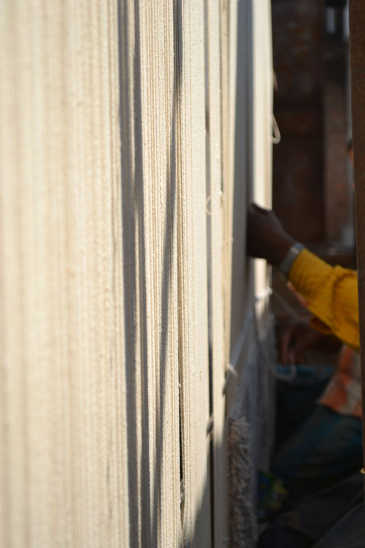 Once the designs are decided and drawn, the wrapping i.e. arranging of the yarn for lengthwise weaving and finally knotting, weaving and then trimming of the carpet is done.