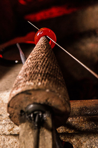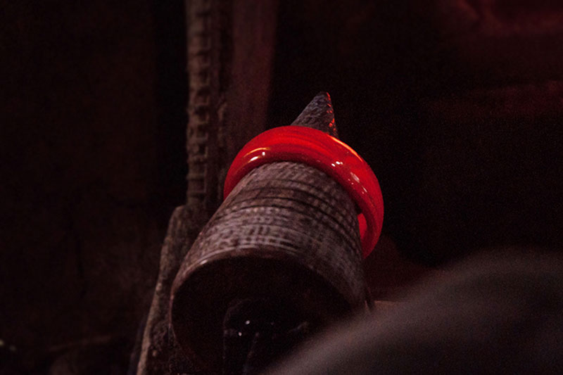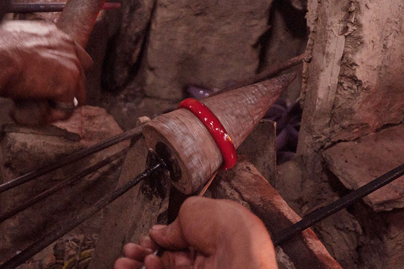 Initially the artisan places large chunks of shattered glass into an open furnace to melt it. He then uses an iron rod to make a loop of molten glass. This molten glass is then transferred to a conical wheel called Khalboot using a long iron pin locally known as “Unaar”.It is also used for maintaining a uniform thickness on all sides of the bangle. A “Khalboot” consists of groves which are marked with different sizes for the bangles. Simultaneously during this process of shaping the bangle on a Khalboot , the bangle is rolled over a powder of golden sparkle also known as “Kirkira” to get the sparkling effect on its surface. This process of coating the surface of bangle is also done by using a glittering strip called “Zari” to form a symmetric pattern on its surface. Finally another layer of molten glass is coiled over the coated surface, and then it is again transferred to the khalboot for subsequent resizing and cooling.