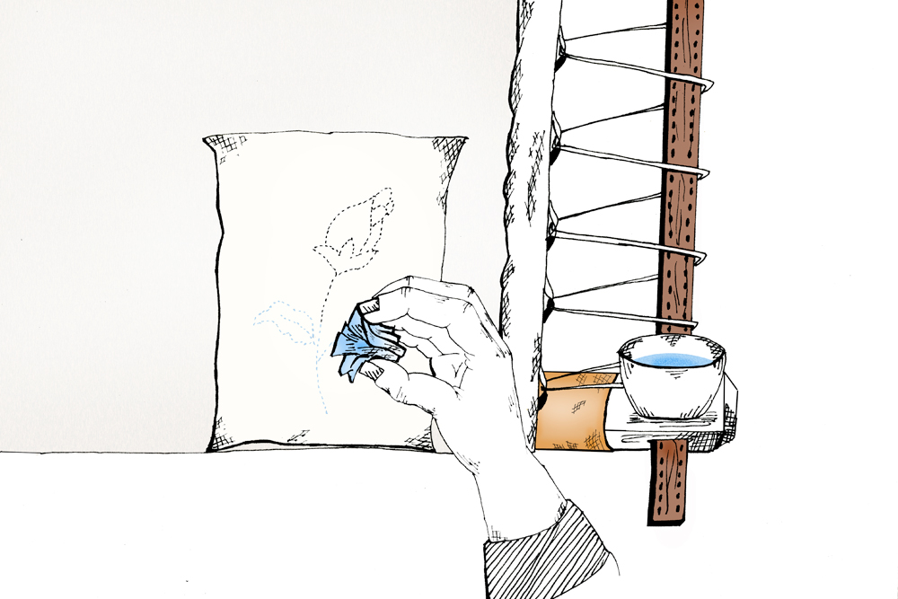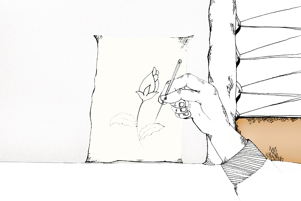 If the designs are to be repeated a number of times then the stamp of the same is made and lightly stamped on the portions with ink to be embroidered. Only the hand reached portions are stretched, rest are rolled, needle with embroidery threads are stitched with the usage of both the hands in the top and the bottom portions of the fabric spread. The extra threads are cut with the scissors to remove the protruding portions on the fabric. After the required portions are embroidered the fabric is cut to the required sizes and the edges of the fabric are given hem stitch generally with the hemp yarn as the final work.