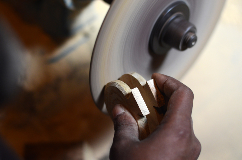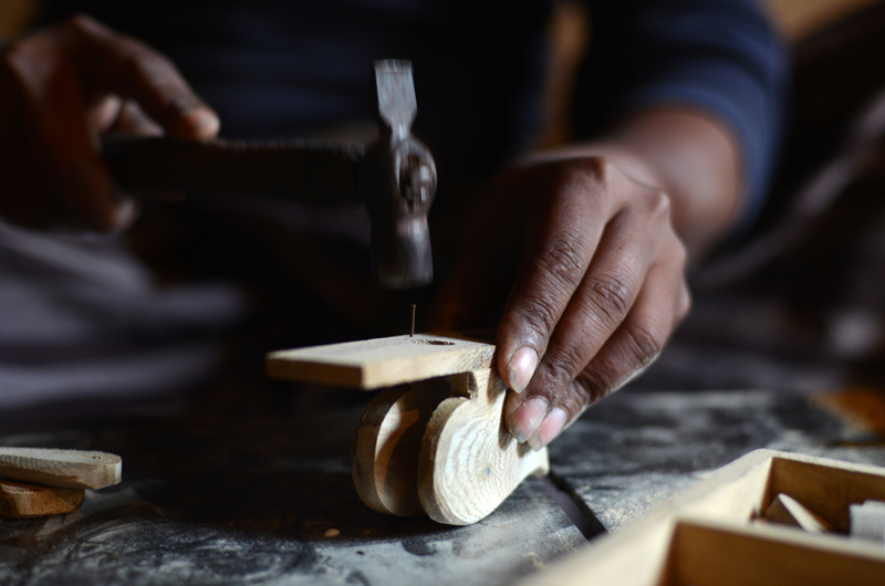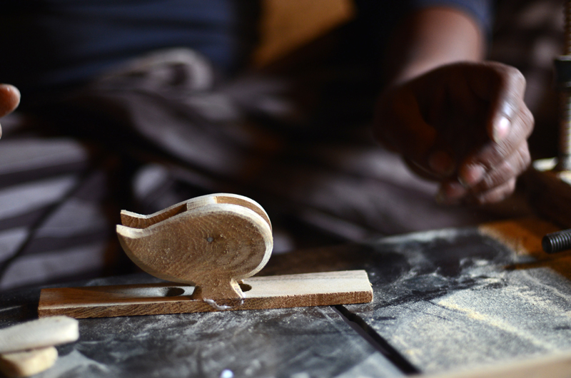 After cutting, filing process is carried out for smoothening and shaping of the parts of parrot. Finely smoothened and shaped parts (torso) are then joined together by applying glue to the opposite sides of a small cuboid. The unit is then nailed for a firm joint and filing is carried out for the combined unit. Holes are drilled, base of torso is glued to rectangular plank having two holes and other parts are attached.