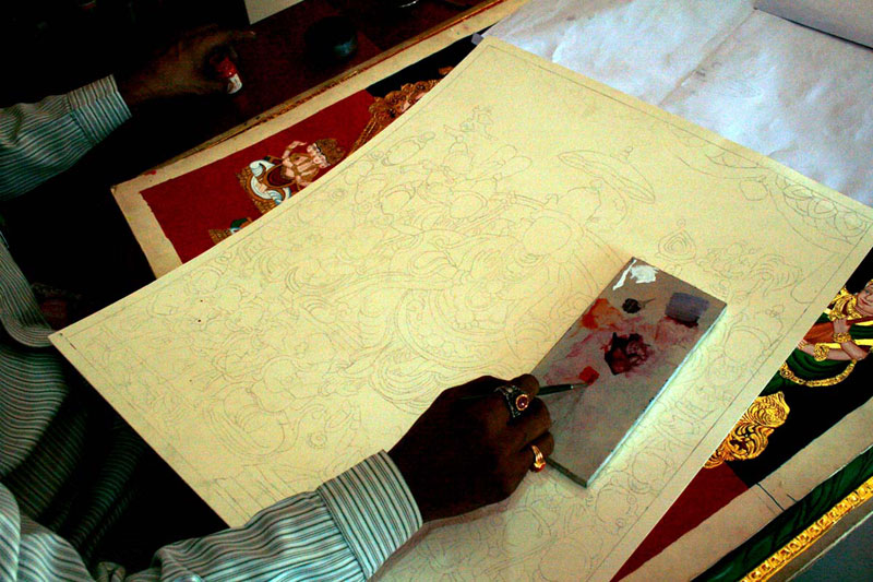 Earlier to make a base for painting, artists used to paste 10-20 layers of newspaper, on that they paste the drawing sheet over which they apply the paste of refined flour (Maida). Now days, artists have changed the technique of using the base. They use mount board, over which they paste ivory sheet or cartridge sheet and start the painting. The first step requires the artist to make a preliminary sketch of the image on the base. Thereafter, he makes a paste of zinc oxide and Arabic gum, known as 'gesso paste'. This paste is used to give a slightly raised effect of carving to those parts of the painting that require embellishments and is allowed to dry. The artist does two coatings of this paste to make a proper raised surface. Then, gold foil is pasted onto the surface, using Arabic gum. Now a day’s fevicolis used in place of gum. Some artists apply varnish after gesso paste so as to avoid cracking of gold foil in future. They left the gold foil dried for another 6-8 hours. After which they use brush to remove the excess gold. Some used cotton in place of brush. Since it is gold foil, which is very expensive, they use the left out gold foil on some other surfaces of painting. The rest of the painting is prepared with the help of water colors. Initially they used natural dyes, which are replaced by synthetic poster colors and water colors in modern times.