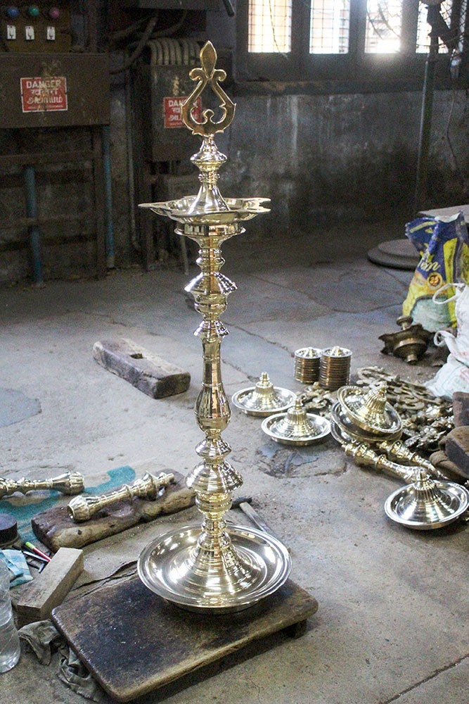 After grinding, it is sent for polishing work. Once the polishing is done, it's sent for design engraving. It is done by hand using various types of chisels. After engraving, the lamps are sent for final polishing. After this polish, the lamps will be glowing. The lamps are now packed and ready for sale.