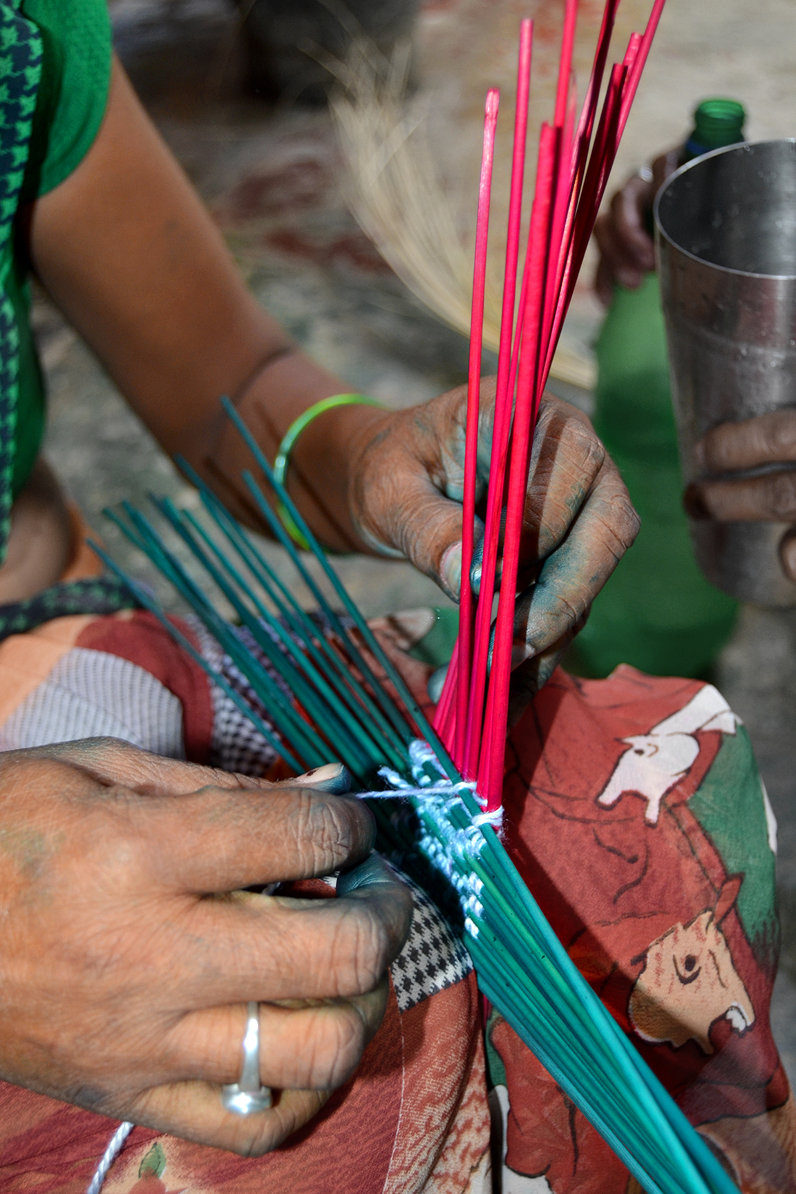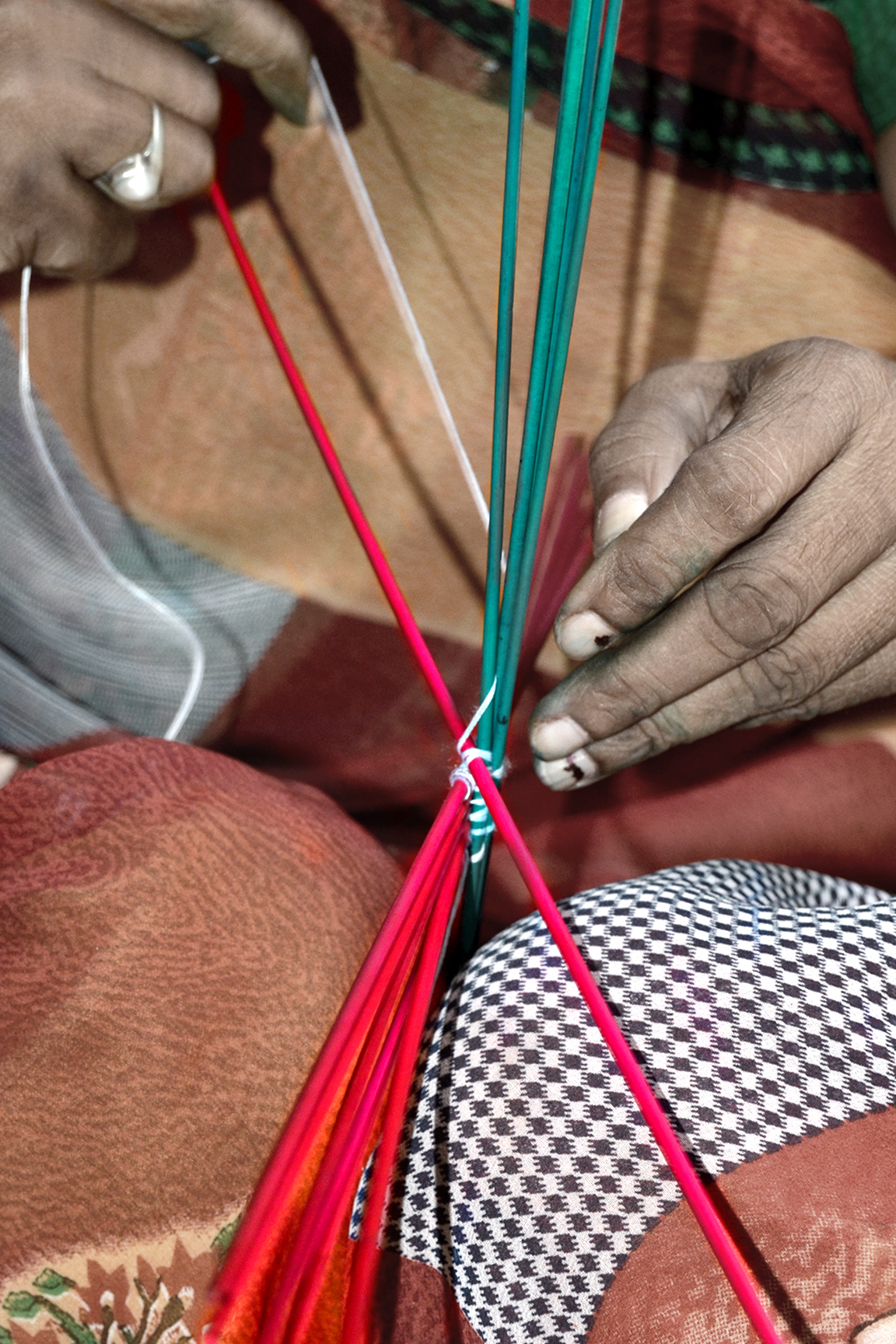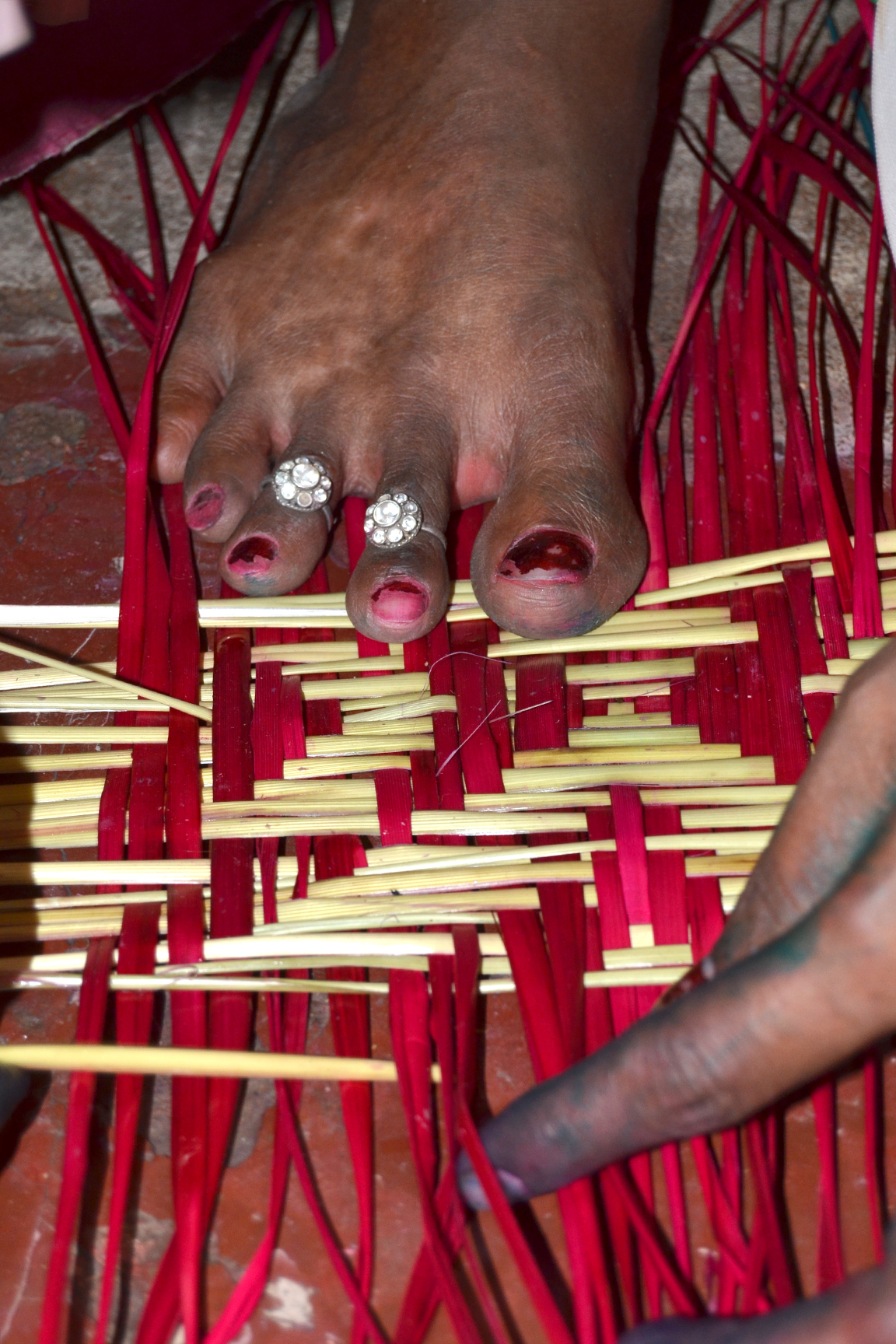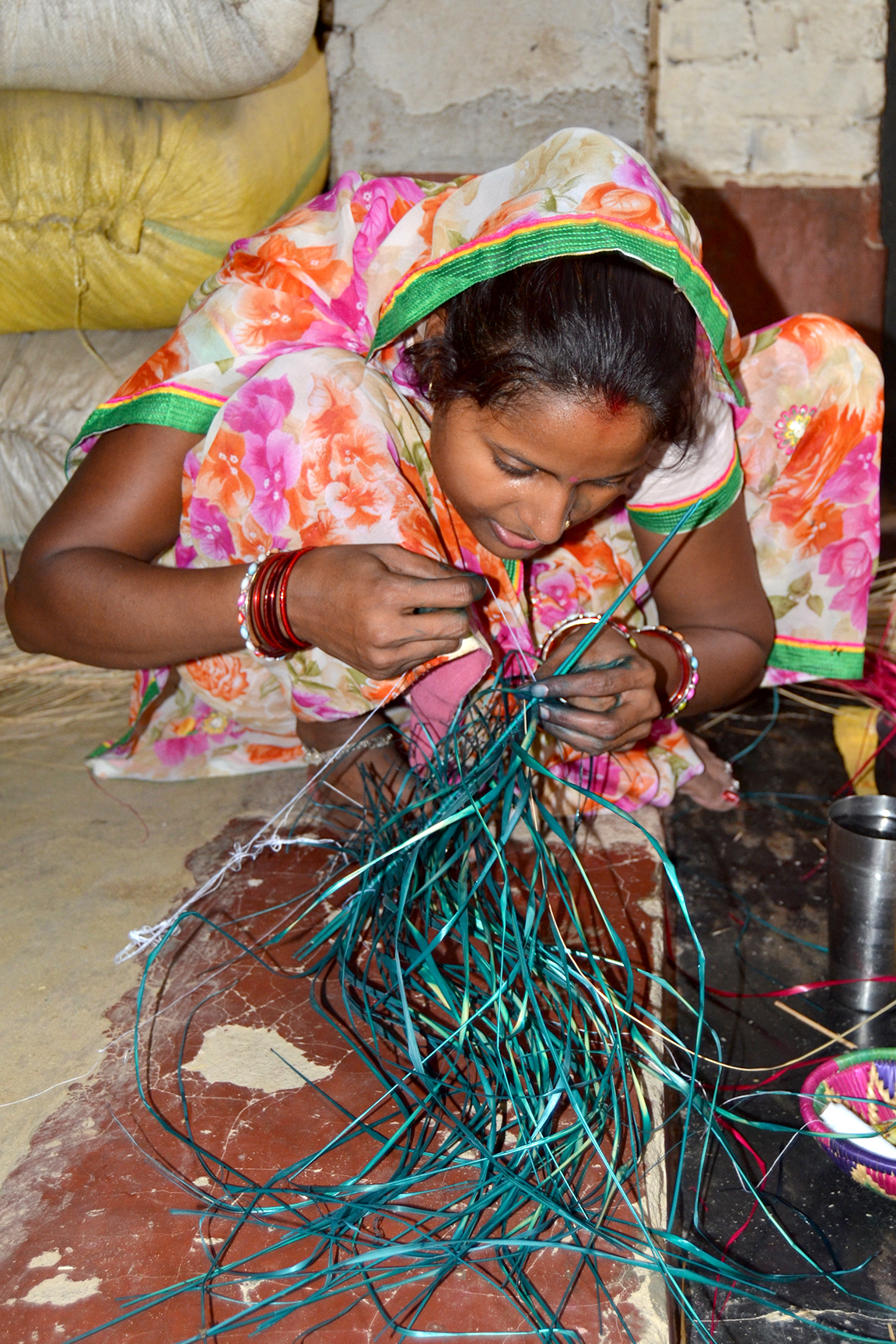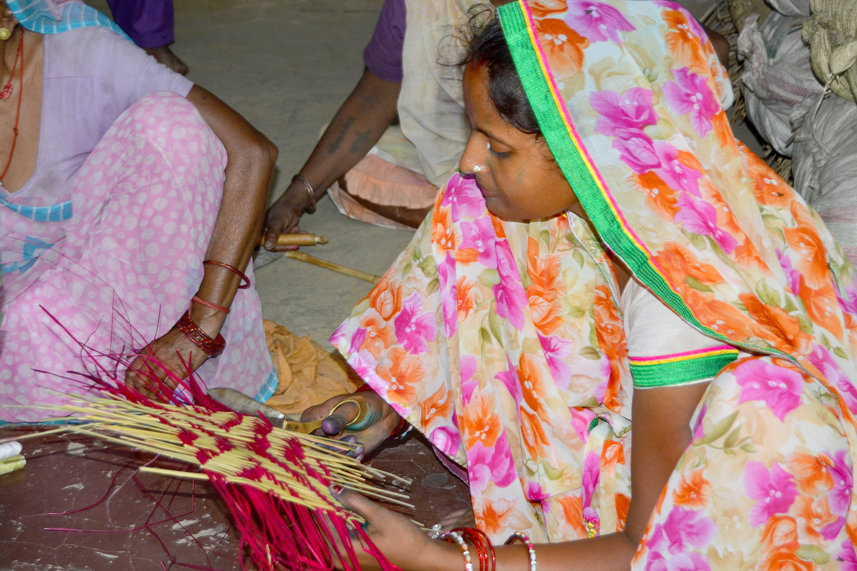 Tall wild grass growing along canals and ponds in the village is torn apart and used as the raw material for these pankhas. Locally it is referred to as moonja/ chirwa/ pharra. Several other materials including cloth, bamboo, palm leaf, straw and mat are also used.